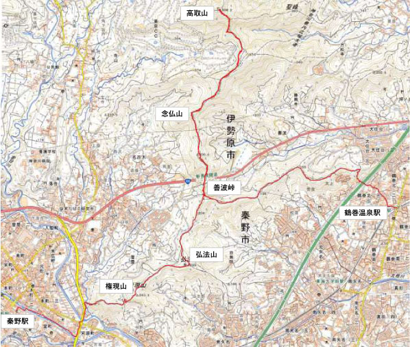 ▼コース : 鶴巻温泉駅 8:50 →9:25吾妻山 →10:05善波峠 →10:40念仏山 →11:50高取山(昼食)12:20 →13:25念仏山 →13:50善波峠 →14:20弘法山→ 14:45権現山 →15:45秦野駅