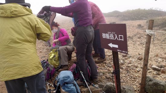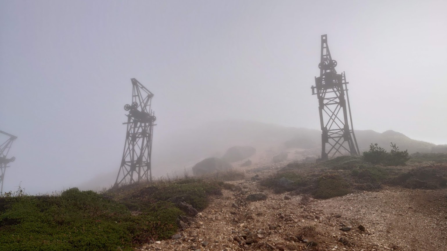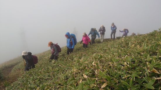 「毛無峠」。風強くガスが流れ少々慌てた出発になりました。御飯岳ピストンの始まり。