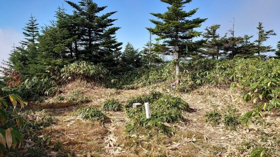 「御飯岳」山頂。笹原を抜けると登りになり樹林帯に入り平らな山頂。