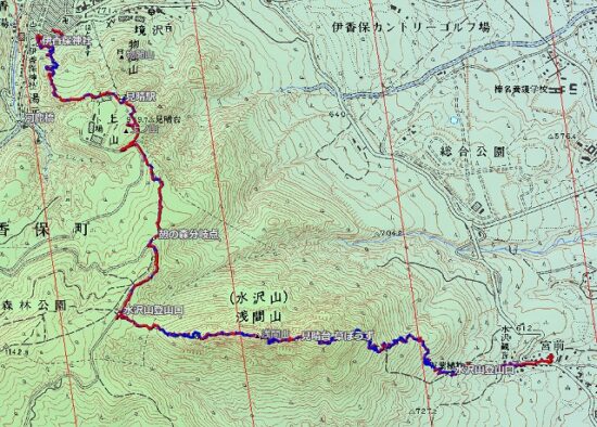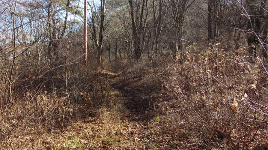 公園を下りて、山道に入りこの広い林道「上野原林道」に出ます。道は狭くなり「水沢山」登山道へ