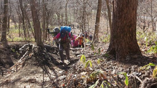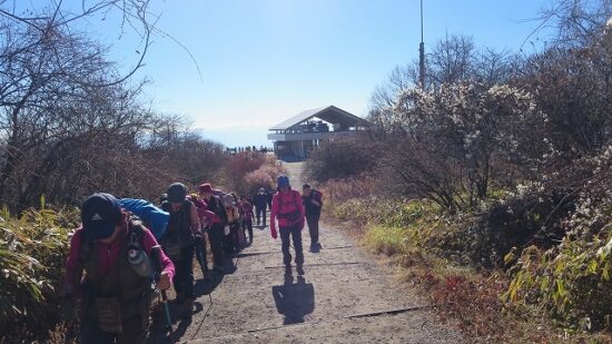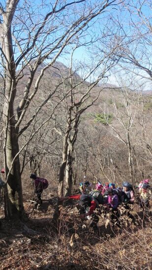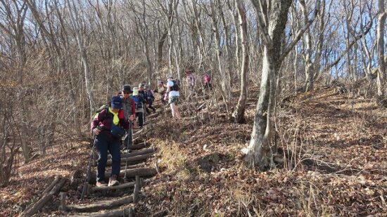 リーダーコメント:快晴とこの時期にしては暖かい気温は予報以上でした。紅葉はすでに終わり葉の落ちた樹林の中からは独特のボコボコした山容が見られて快適でしたが、二日間とも上りも下りも急で皆で注意の声掛けしながら歩いた。両山ともハイカーが多く人気さが伺えた。余談ですが、昭和の大女優、高峰三枝子さんはこの榛名湖畔を舞台にした名曲「湖畔の宿」を大平洋戦争の慰問で歌ったそうです。目を閉じ、直立不動で聴く若い兵士たち。後に、彼らが特攻兵だったと知らされ高峰さんは衝撃を受けたそうです。