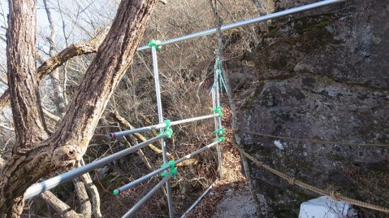転落防止の鉄パイプ。右の岩にあたると左の切れた崖下に落下する恐れ大きい。
