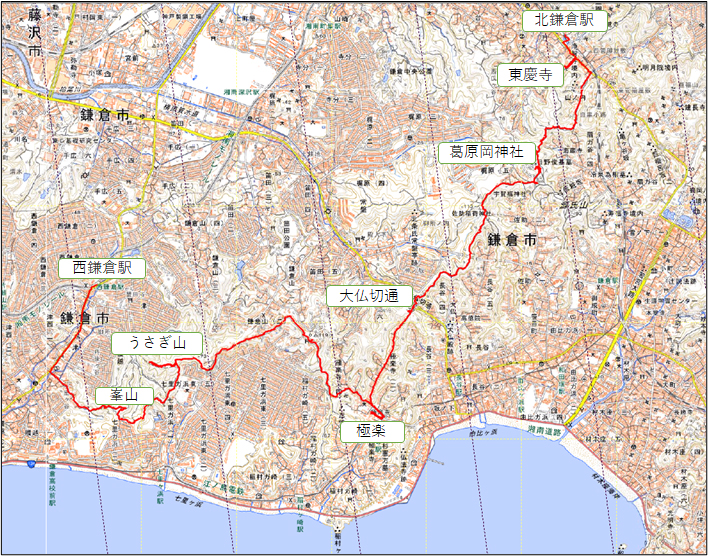 ▼コース : 西鎌倉 09:17 – 09:34 鎌倉緑地室ヶ谷入口 – 09:42 峯山 – 10:15 うさぎ山 – 10:34 鎌倉緑地鎌倉山入口 – 10:55 鎌倉山神社 – 11:18 極楽寺 – 11:40 長谷配水池広場(昼食) – 12:17 大仏切通し – 13:18 葛原岡神社 – 13:40 浄智寺 – 13:52 東慶寺<解散> – 14:00 北鎌倉駅