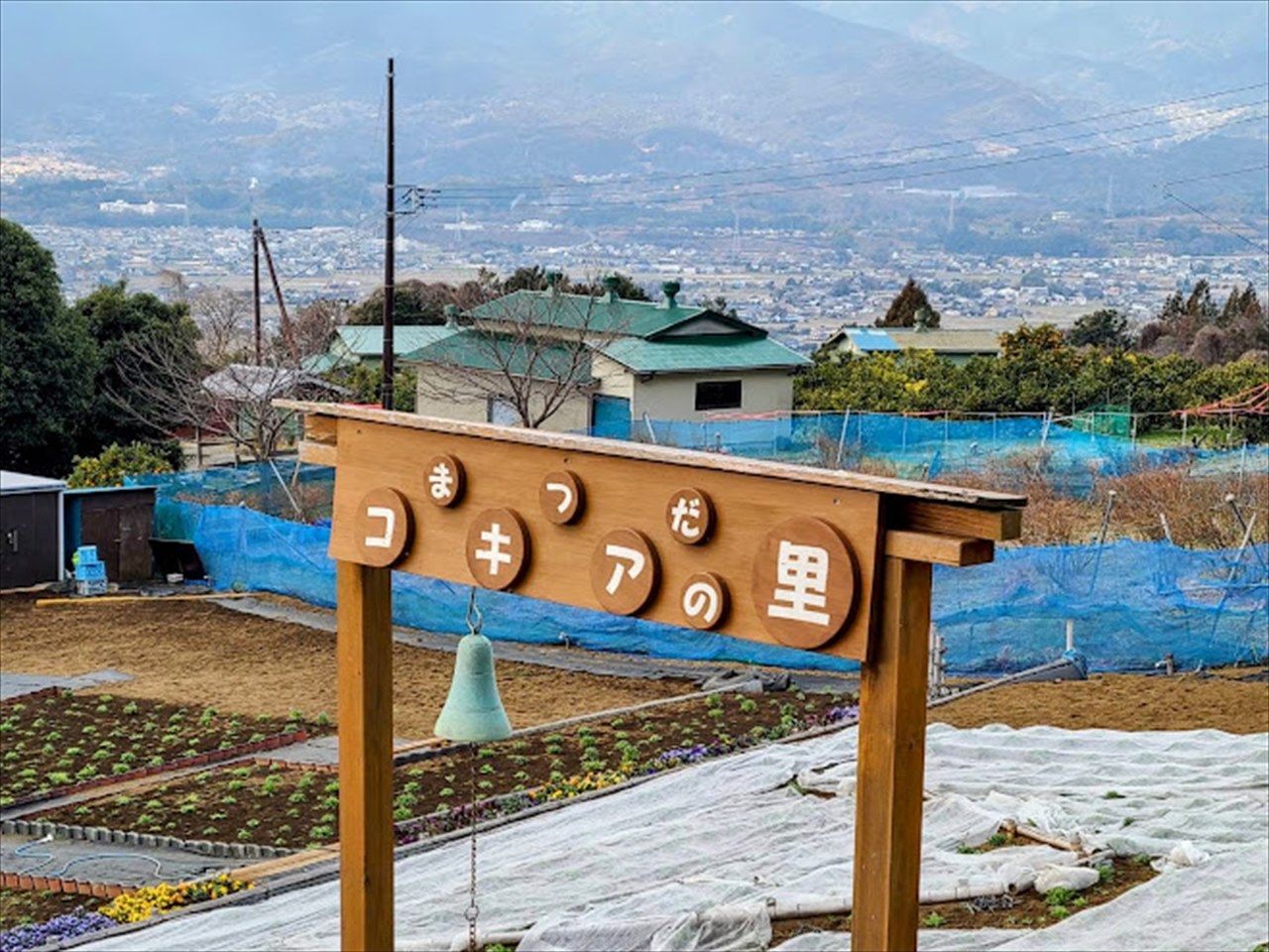 まつだコキアの里。4月から5月には、澄んだブルーの可愛らしい花ネモフィラが、10月には緑から真っ赤に見事な紅葉を見せるコキアが一面を覆います。