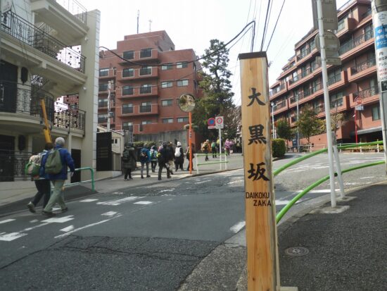 大国坂とも書きます。坂の中腹北側に大黒天(港区七福神のひとつ)をまつる大法寺があったために呼んだ坂名です。