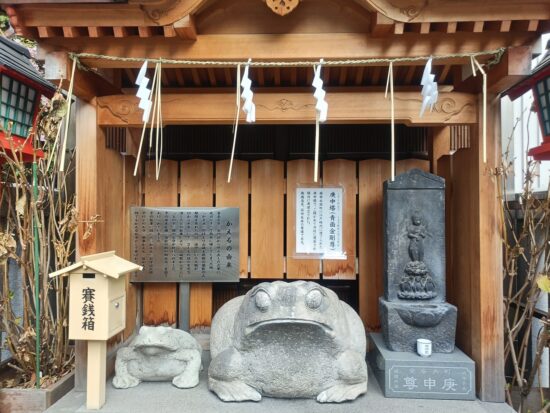 正面に向かって鳥居右手にお祀りされており、地元の皆さんより「かえるさん」と親しまれています。