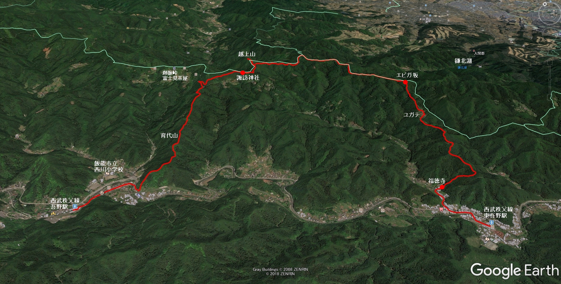 | 「ルート案内」 吾野駅スタート 9:32→ 登山口 9:42→ 育代山 10:45→ 諏訪神社 11:45→ 越上山 12:38→ エビガ坂 14:10 → ユガテ →14:30 → 福徳寺 15:22 → 東吾野駅ゴール 15:37。 距離:10.67km 、所要時間:6時間07分。(GPSデータ参照) |