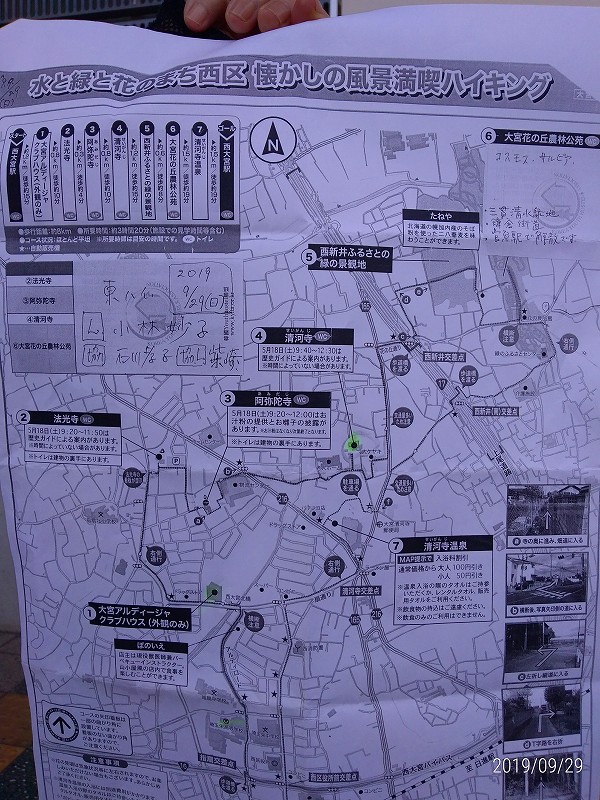 埼京線西大宮北口改札集合10時——10時30分西区役所—————アルディロード——-10時40分埼玉栄高校——–10時53分大宮アルディージャクラブハウス——-11時10分-法光寺-シイノキ—-11時30分阿弥陀寺–清河寺–大ケヤキ11時10分———12時40分西新井緑の景観地———-大宮花の丘農林公苑食品館13時42分—–公苑内周遊—-14時14分戸崎の浅間塚神社———三貫清水—-鎌倉街道——–14時55分宮原駅解散