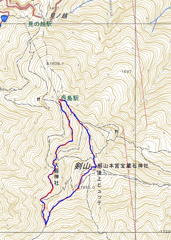 4日目:見ノ越駅=(リフト)=西島駅09:05→刀掛の松9:15~25→剣山10:00~10→分岐10:35→大剣神社10:50~55→西島駅11:25~35=(リフト)=見ノ越駅