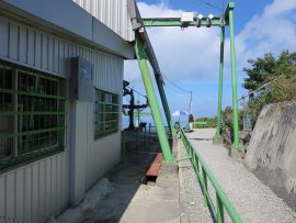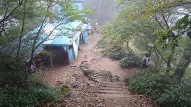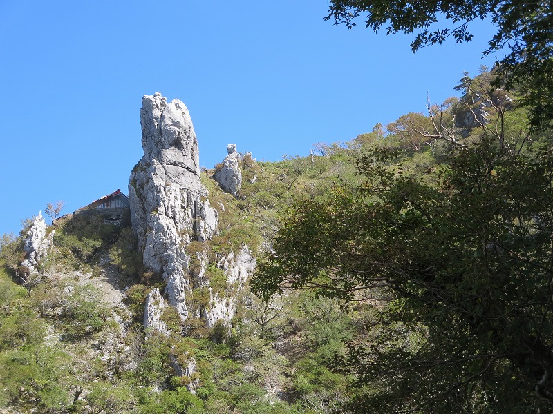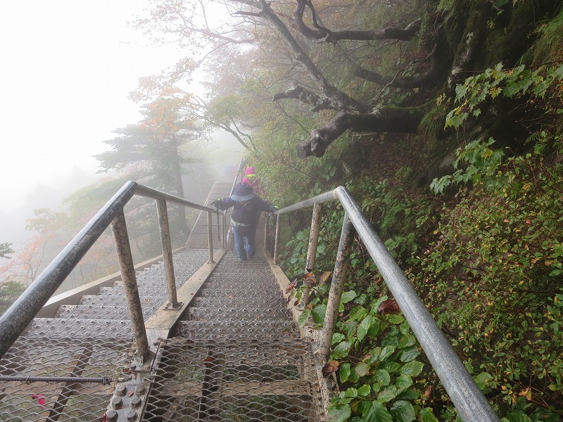 不規則な幅の階段を登り 「前の森」売店。後方には下りのクサリ場