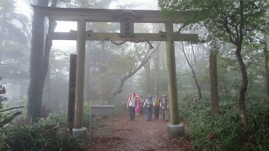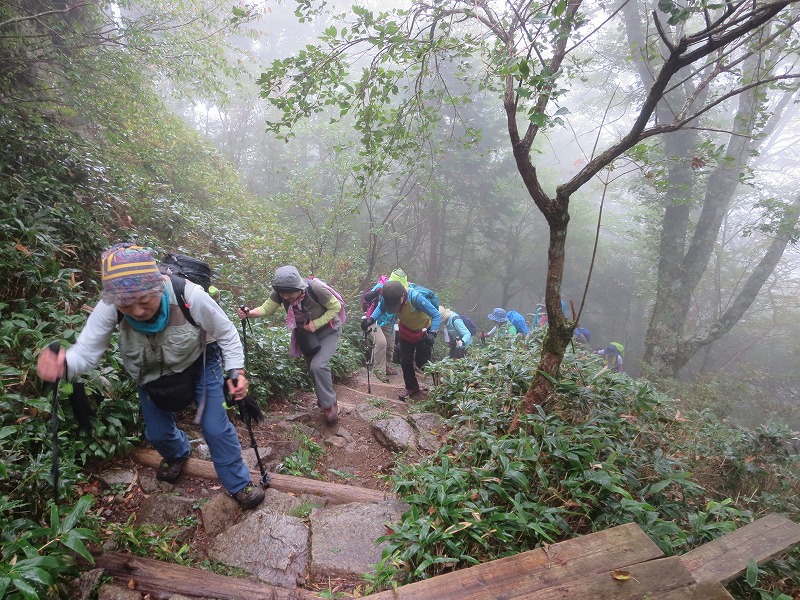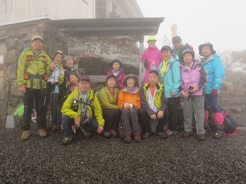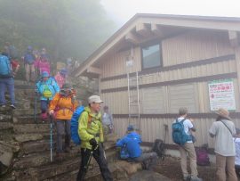 ●「石鎚山」登山は前日までの青空を期待したが、朝からの霧と小雨は残念。グループとしては1番乗りの歩きは傾斜も緩やかで少ない花を探しながら歩く。やがて階段が現れるが山頂近くは金属製の階段になる。下山は次から次へと上ってくるが若者が多いのが印象に残った。