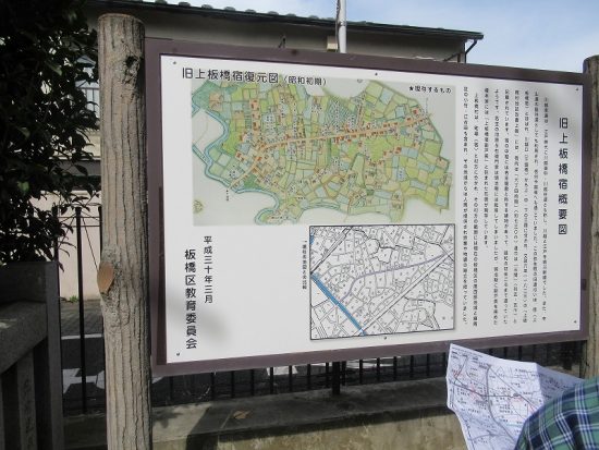 境内には上板橋宿復元図があります。「六丁四拾間」約730mと記されていて小さな宿場だったようです。本陣、脇本陣もなく、名主の河原与右衛門家がその役を務めていたそうです。
