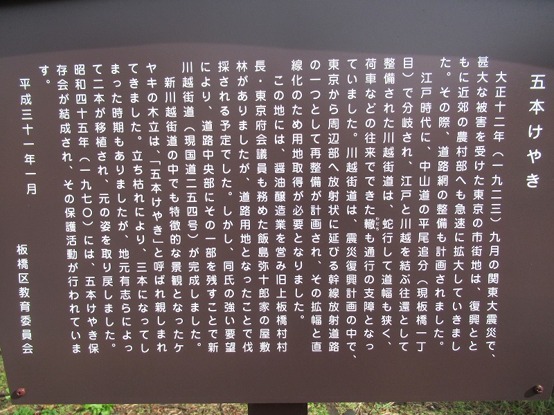 昭和初期の川越街道の拡張工事の際、この辺りの村長をしていた飯島氏が屋敷林の一部のケヤキを残すことを条件に土地を提供しました。