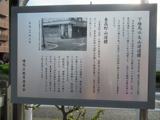 旧川越街道とふじ大山道の分岐点に宝暦三年(1753)八月、下練馬講中によって建てられた道標です。