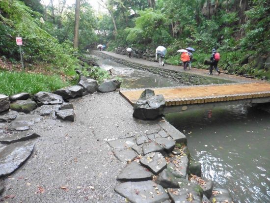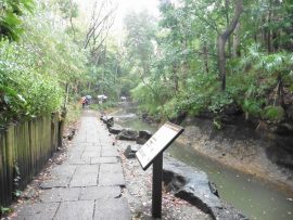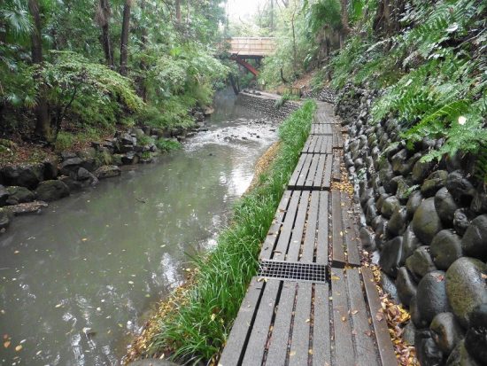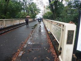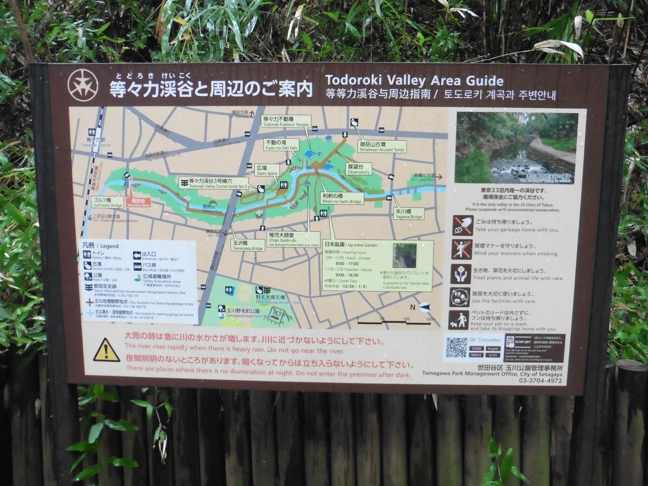 東急田園都市線用賀駅(10:30)→首都高速高架下→谷沢川沿い・姫之橋→区立権蔵橋公園(11:28)休憩→ゴルフ橋→等々力渓谷・不動尊(11:39~12:50)昼食→多摩川河川敷(13:05)→東急東横線多摩川駅(14:10)解散