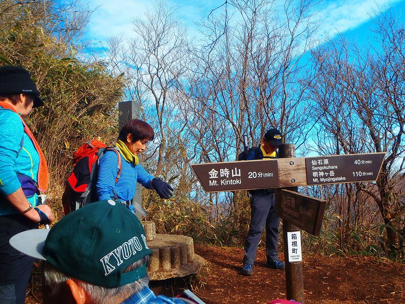 小田原9:05発バス→宮城野営業所 (乗換え)→金時山登山口10:40—-登山口10:50—–うぐいす茶屋—-金時神社分岐—-金時山12:20(昼食)——-金時登山口14:18→宮城野営業所→小田原