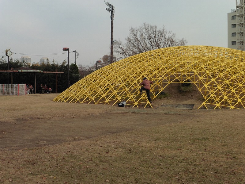 面白い遊具 黄色い大きなジャングルジム下からもぐってみたり、上をのぼってみたり