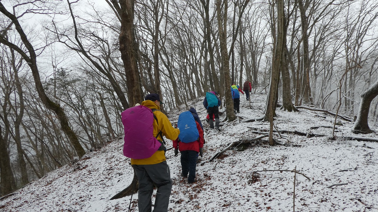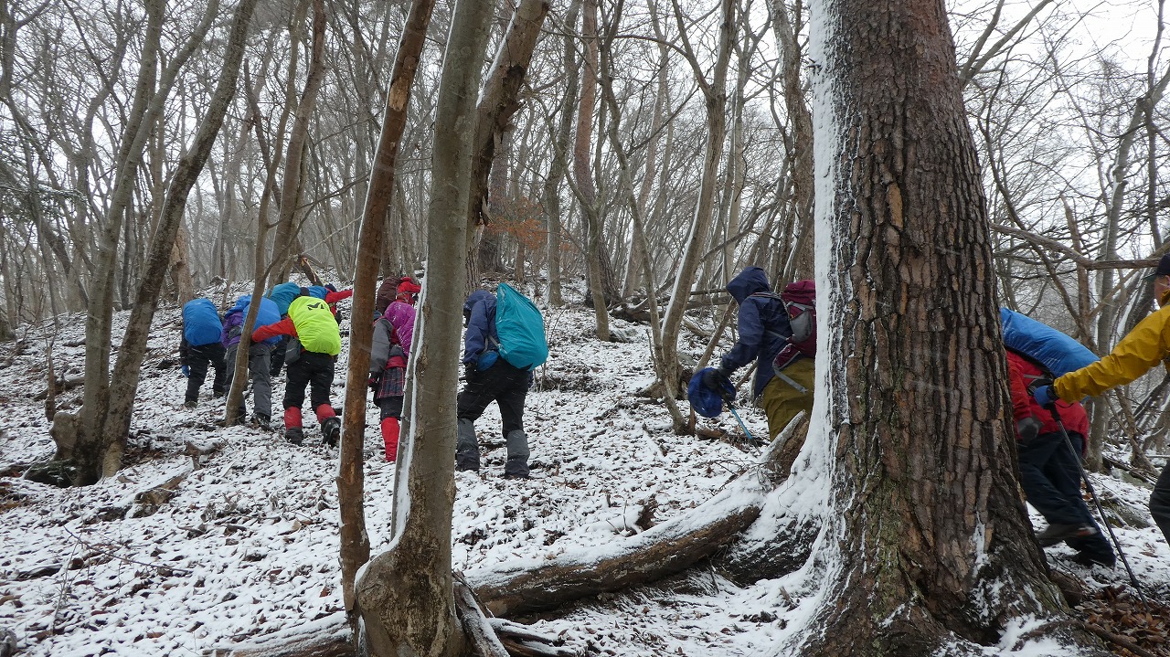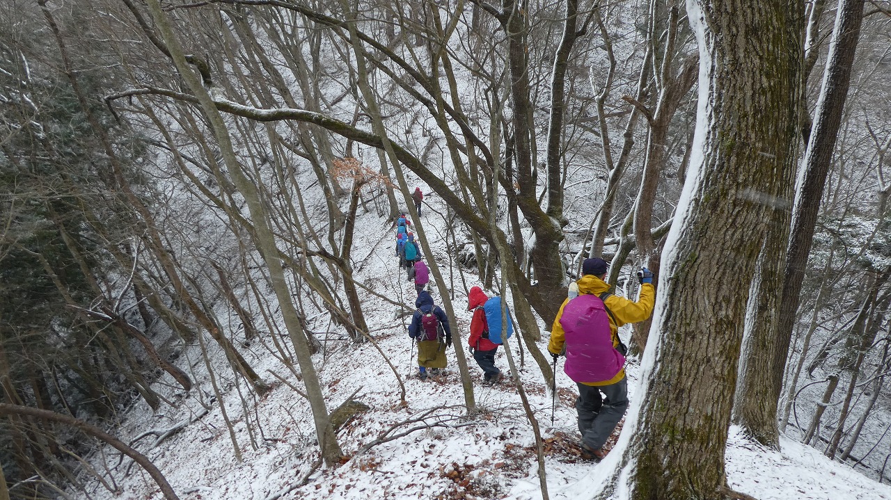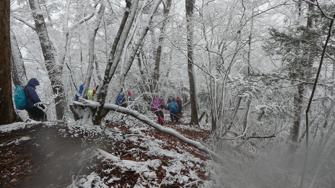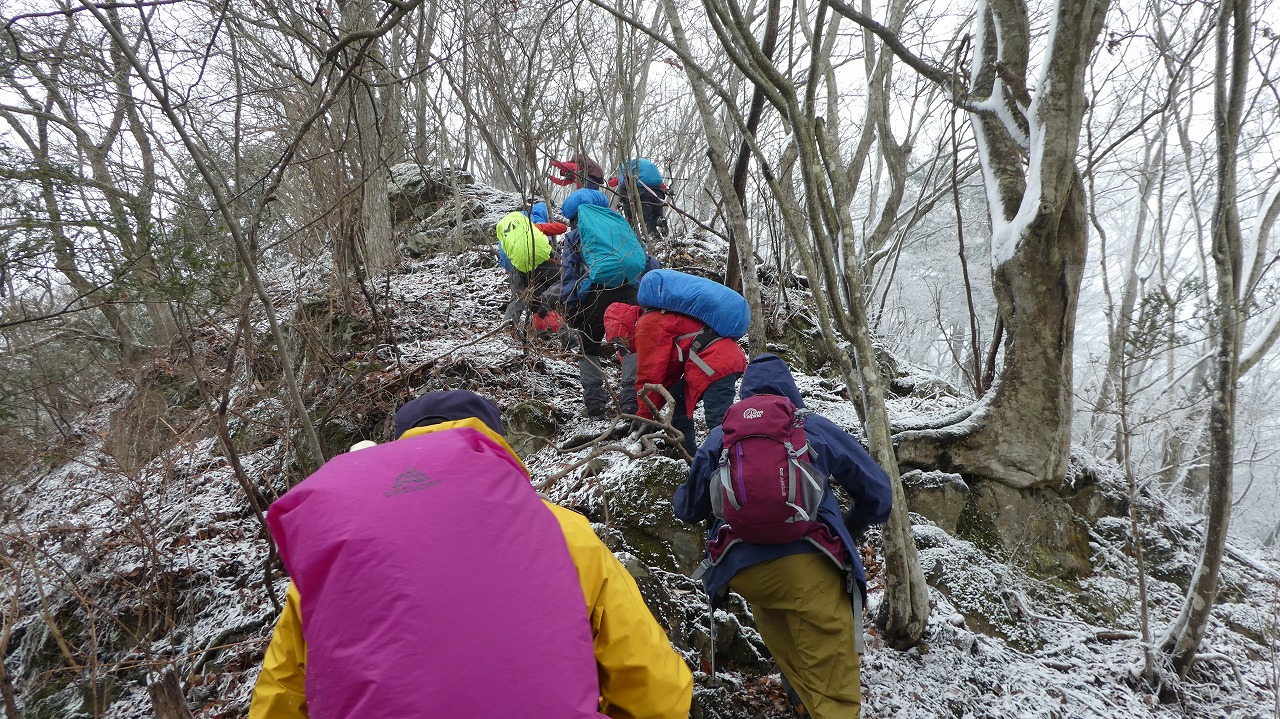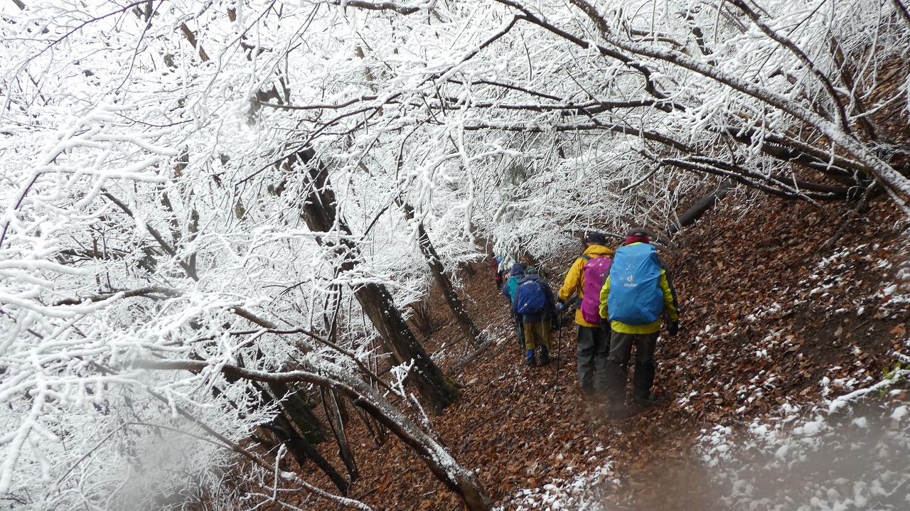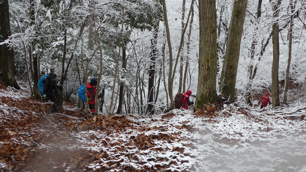 加藤(栄)・坂寄・山川サブLにも守られ、コースの70%がバリエーション、しかも高度が上がる毎に降雪量が増え、急登あり、岩場あり、ロープあり、、、おまけに落ち葉の絨毯の上の積雪。 足首までの積雪でルートの判断が難しい中、的確にラッセルをして軌跡を作ってくれました。休憩毎にリーダー・協力者様が集まり話し合い、私達に説明してくれて、何の不安も無く予定通りのルートを完登出来ました。スッテンコロリンしないよう下ばかりみて歩いていて、加山様の投稿写真を見て、誰一人いない幽玄な水墨画の世界がよみがえり、感激ひとしおです。リーダー、サブリーダー、協力者様、安全に導いていただき大感謝!ありがとうございました。忘れられない山行の一つになりました。