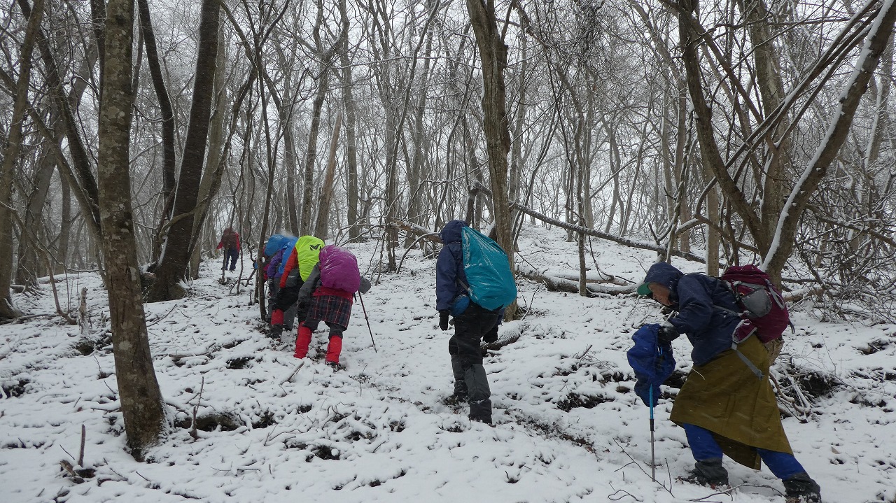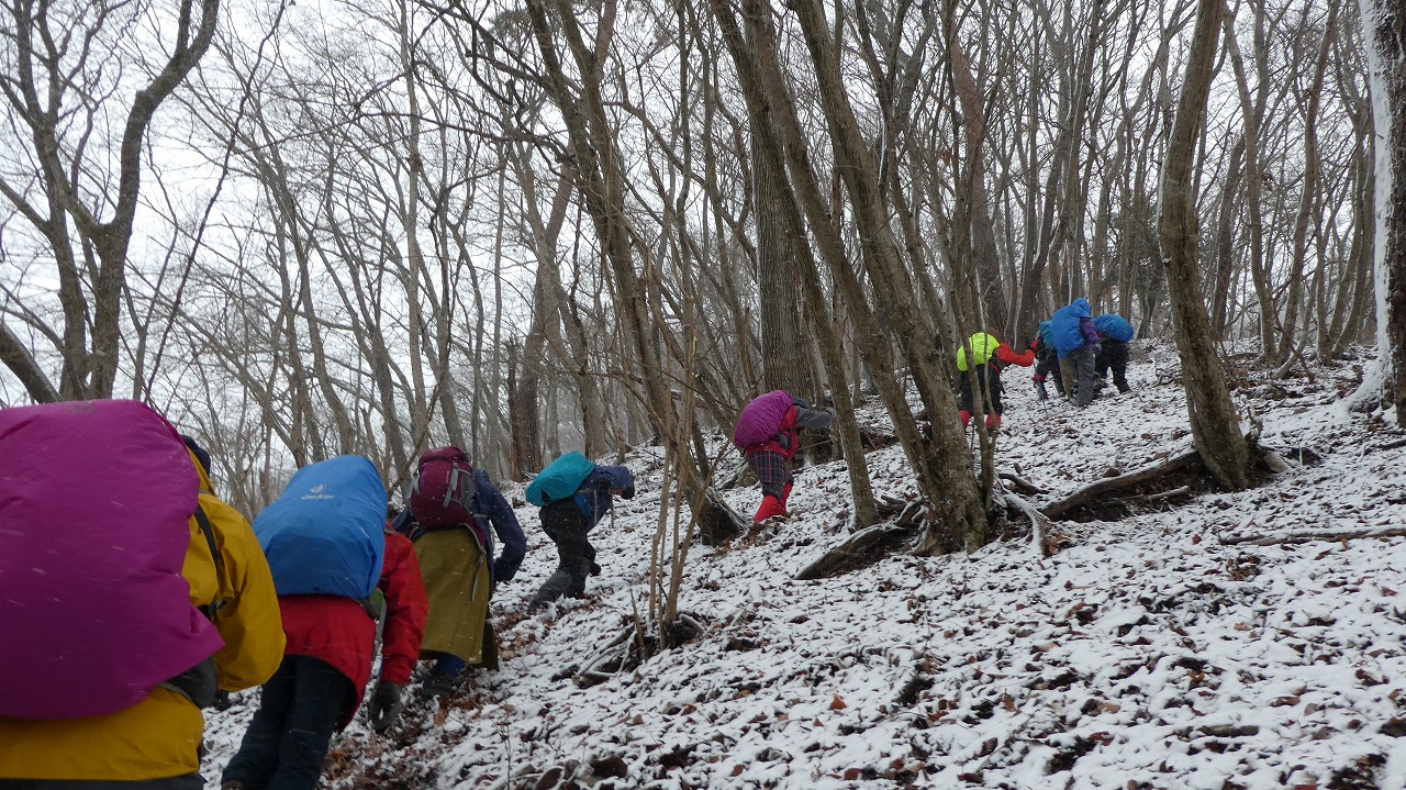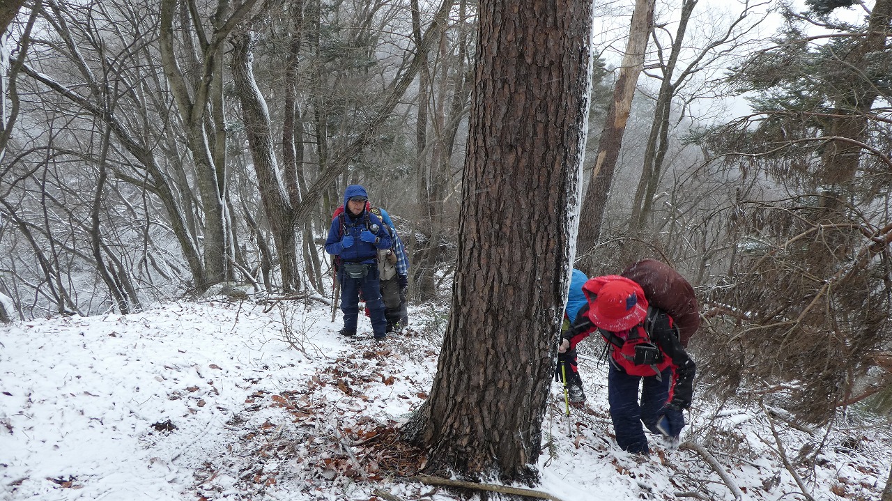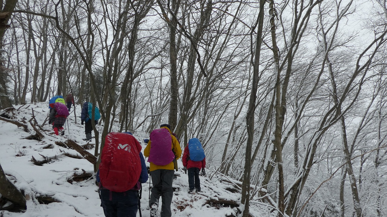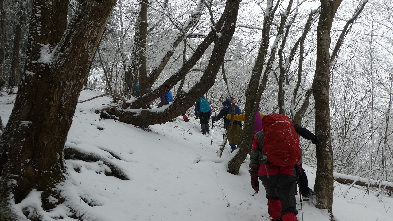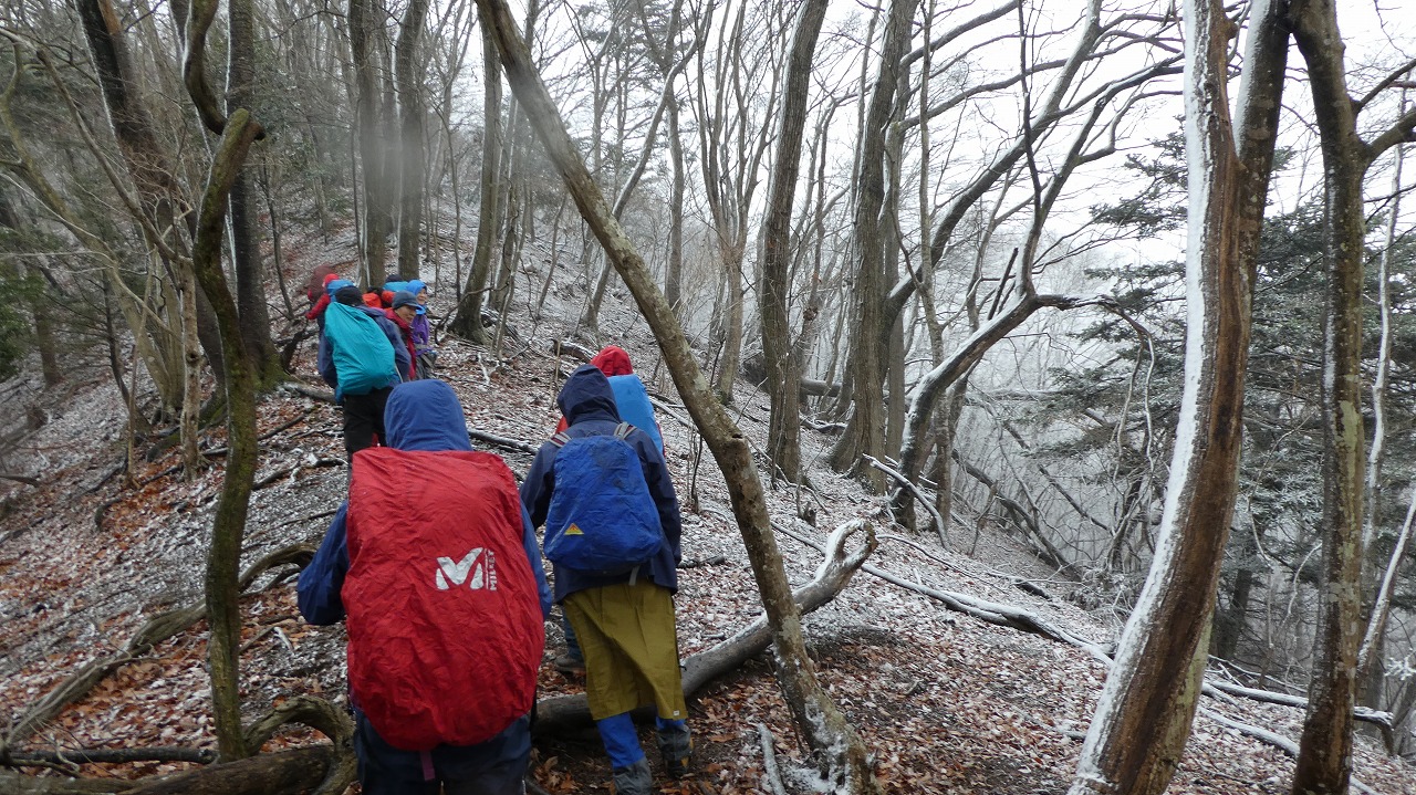 加藤(栄)・坂寄・山川サブLにも守られ、コースの70%がバリエーション、しかも高度が上がる毎に降雪量が増え、急登あり、岩場あり、ロープあり、、、おまけに落ち葉の絨毯の上の積雪。 足首までの積雪でルートの判断が難しい中、的確にラッセルをして軌跡を作ってくれました。休憩毎にリーダー・協力者様が集まり話し合い、私達に説明してくれて、何の不安も無く予定通りのルートを完登出来ました。スッテンコロリンしないよう下ばかりみて歩いていて、加山様の投稿写真を見て、誰一人いない幽玄な水墨画の世界がよみがえり、感激ひとしおです。リーダー、サブリーダー、協力者様、安全に導いていただき大感謝!ありがとうございました。忘れられない山行の一つになりました。