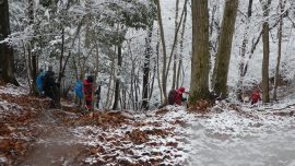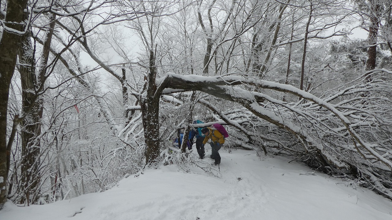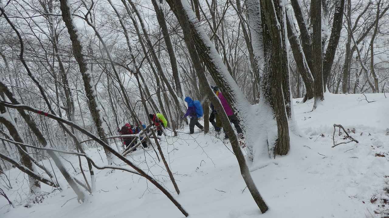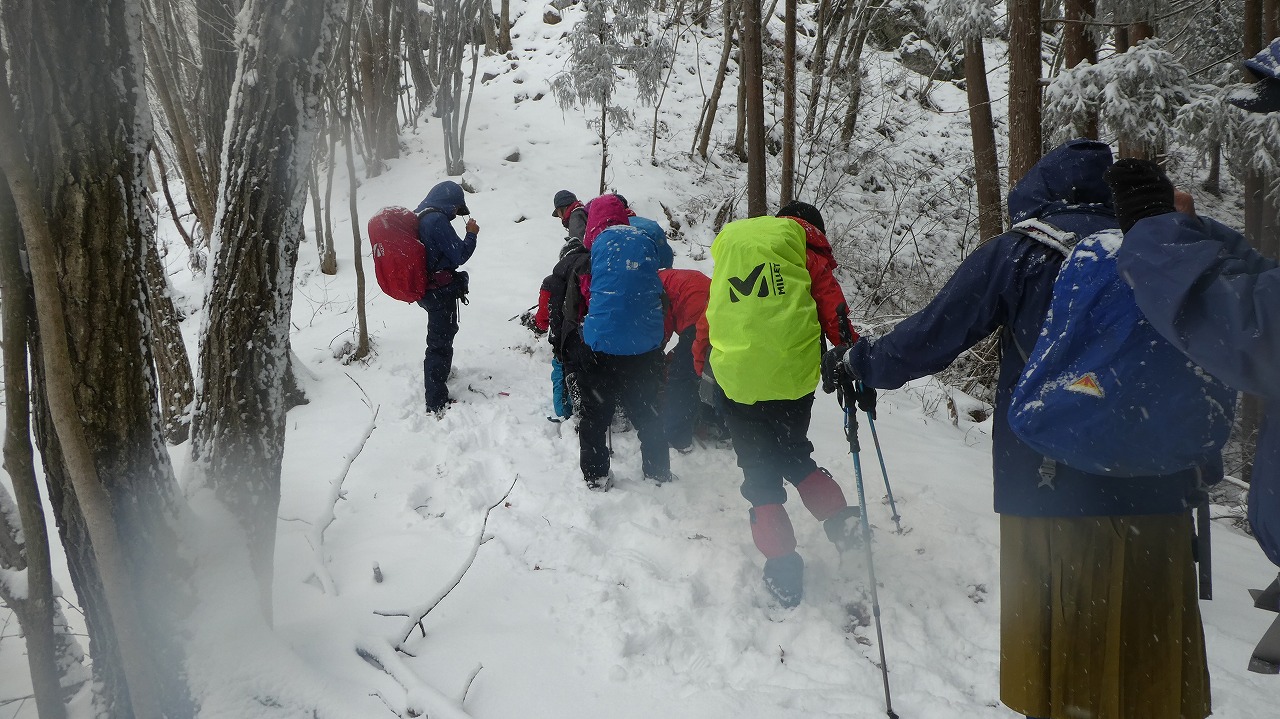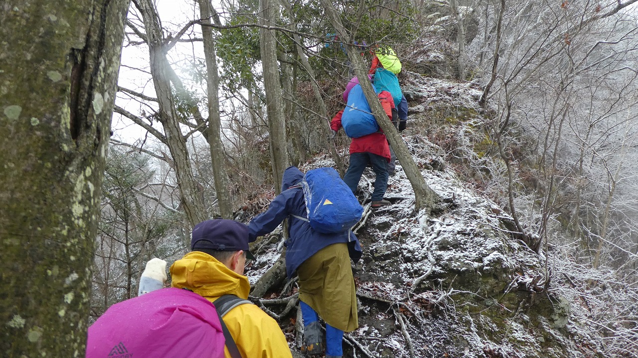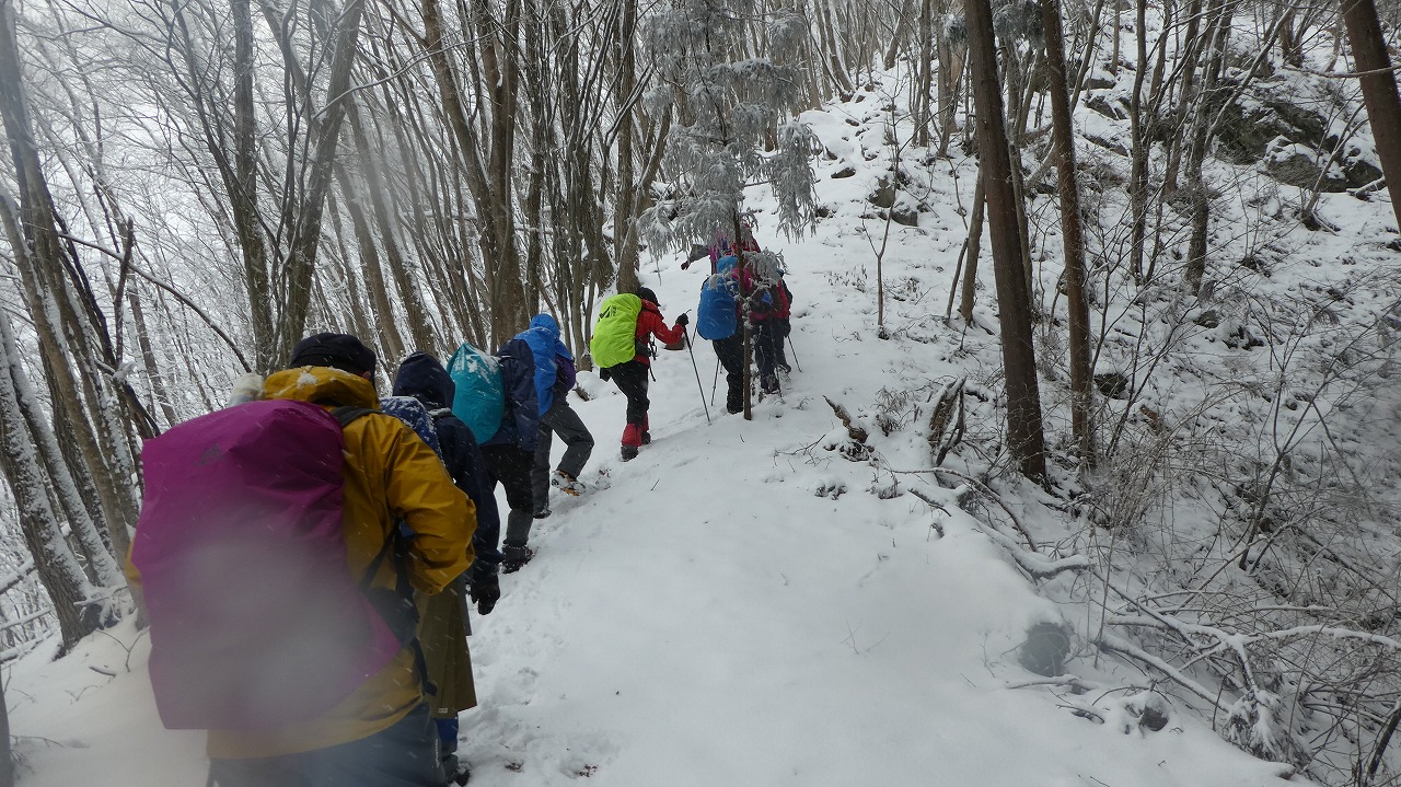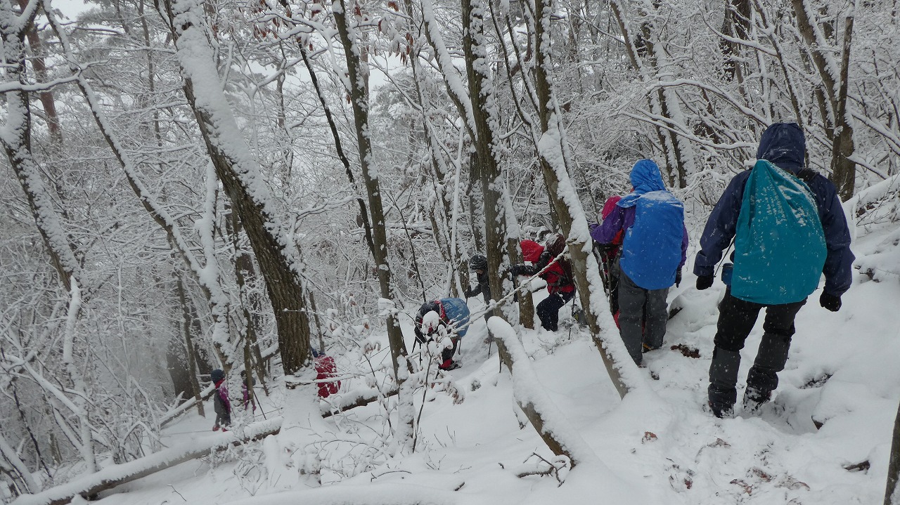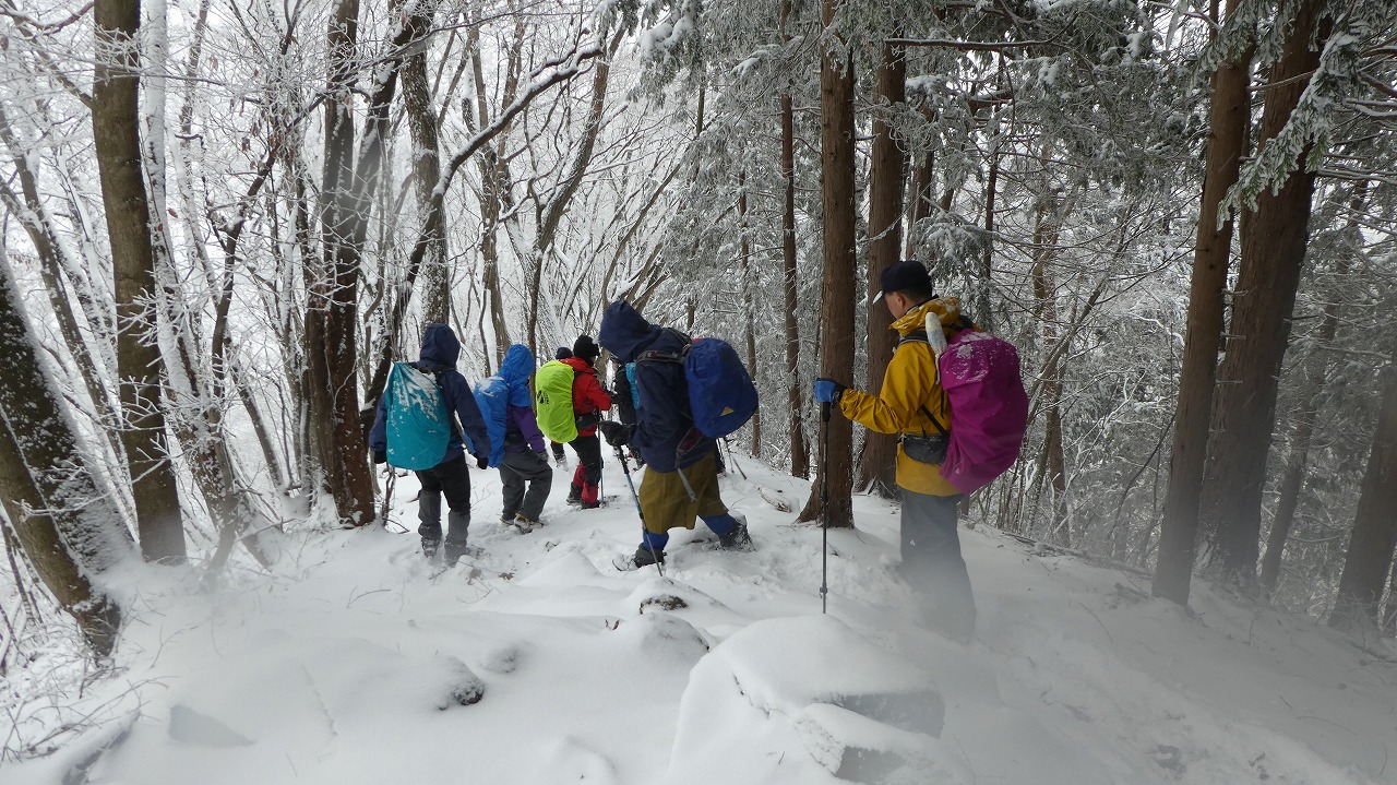 加藤(栄)・坂寄・山川サブLにも守られ、コースの70%がバリエーション、しかも高度が上がる毎に降雪量が増え、急登あり、岩場あり、ロープあり、、、おまけに落ち葉の絨毯の上の積雪。 足首までの積雪でルートの判断が難しい中、的確にラッセルをして軌跡を作ってくれました。休憩毎にリーダー・協力者様が集まり話し合い、私達に説明してくれて、何の不安も無く予定通りのルートを完登出来ました。スッテンコロリンしないよう下ばかりみて歩いていて、加山様の投稿写真を見て、誰一人いない幽玄な水墨画の世界がよみがえり、感激ひとしおです。リーダー、サブリーダー、協力者様、安全に導いていただき大感謝!ありがとうございました。忘れられない山行の一つになりました。