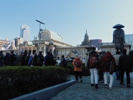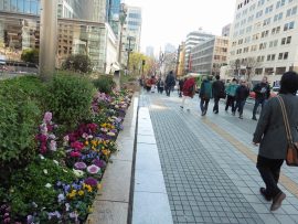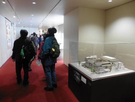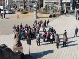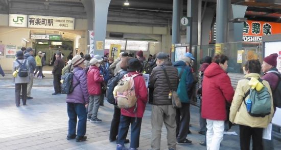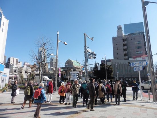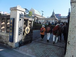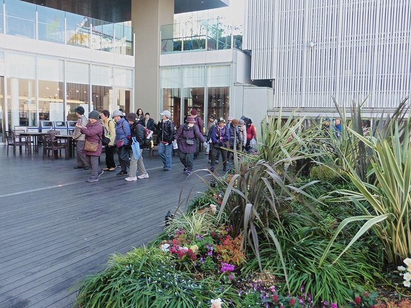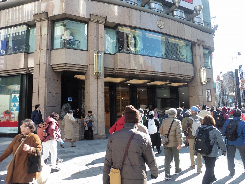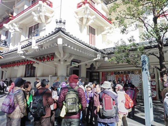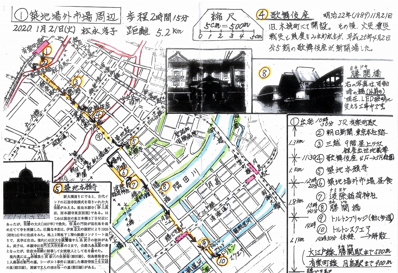 JR有楽町駅中央口(10:30)→三越屋上(10:50)→歌舞伎座・ギャラリー回廊(11:10)→築地本願寺(11:35)→築地場外市場で昼食(11:50~13:05)波除稲荷神社集合→勝鬨橋→トリトンブリッジ(動く歩道)→トリトンスクエア(13:40)解散