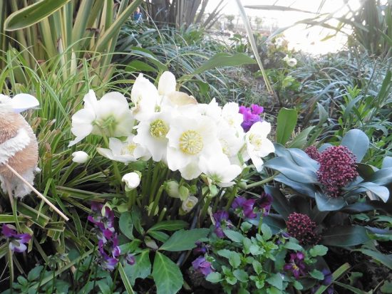 植栽スペースとの境の段差を活用したベンチ 一角に神社&お地蔵様
