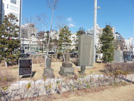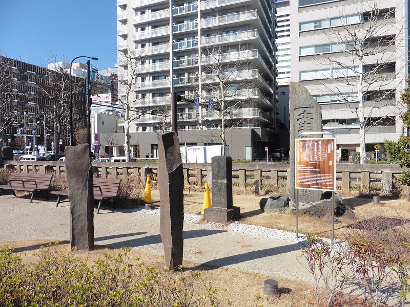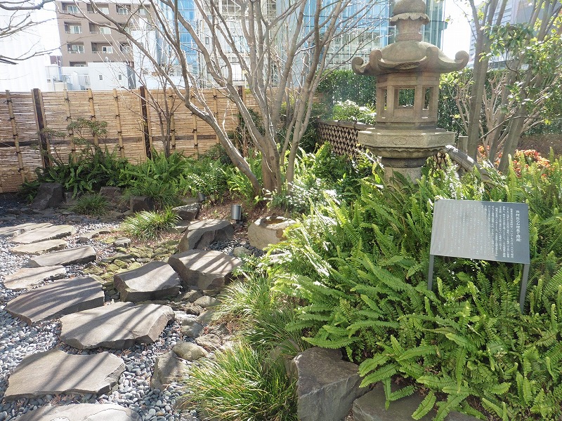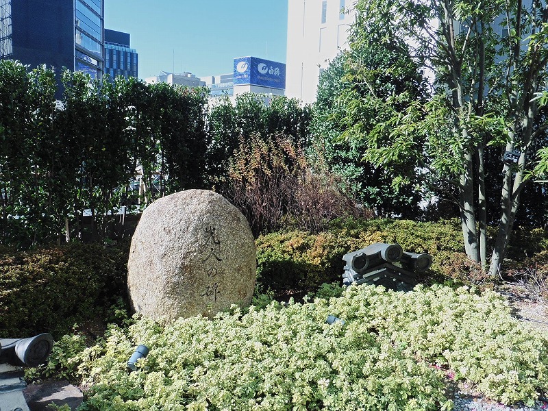 緑の中に「先人の碑」や「黙阿弥の石燈籠と蹲踞(つくばい)」など、歌舞伎にまつわる記念碑