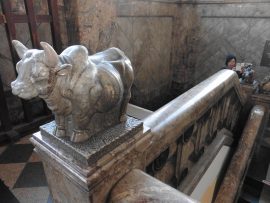 本堂入口扉の上部を彩るステンドグラス 牛 仏教の説話に関連深いモチーフ