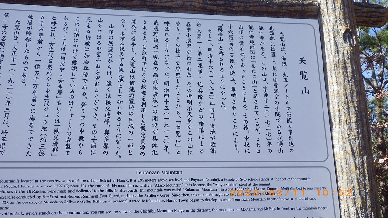 コース:飯能駅9:45→観音寺10:03→飯能恵比寿10:10→能仁寺10:25→天覧山11:10