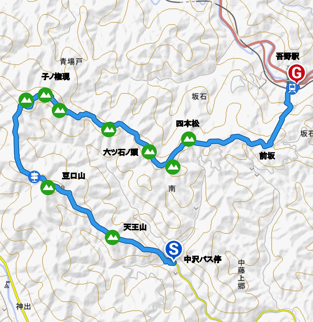 コース :飯能駅北口8:22-(バス)-8:56中沢9:05-9:43天王山9:48-10:30豆口山