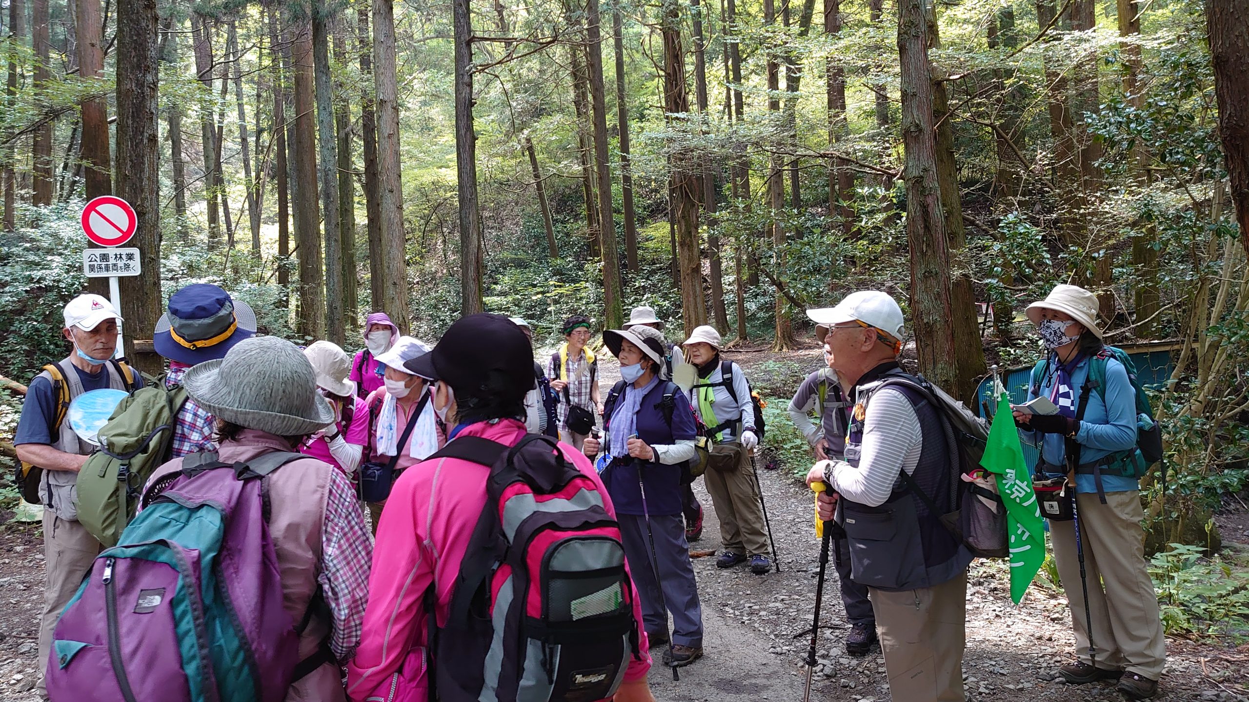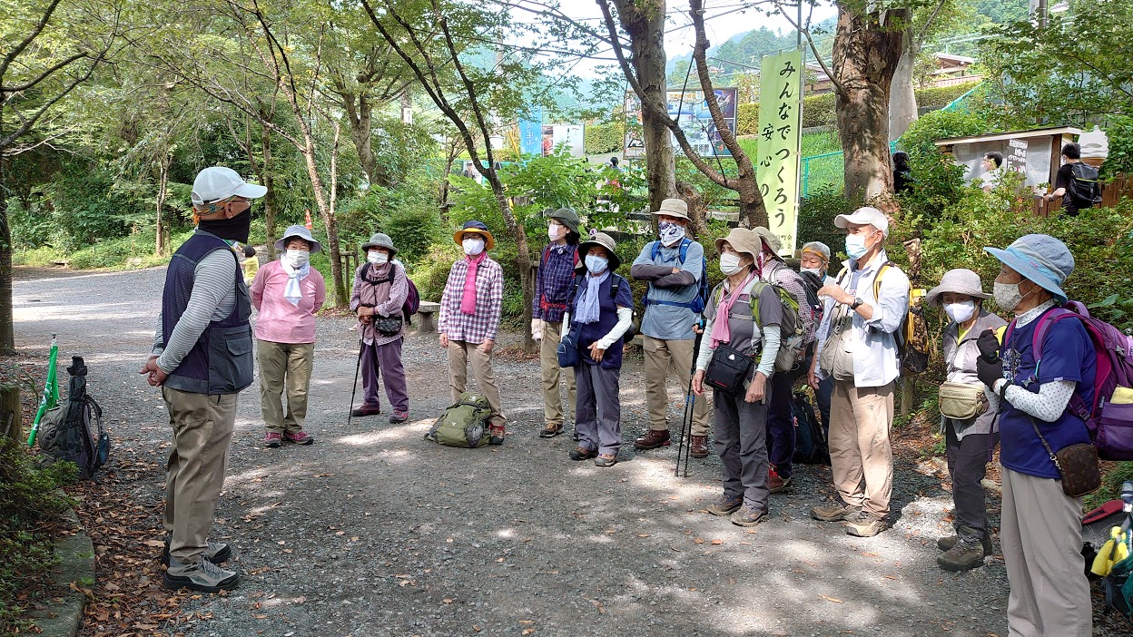登山口近くでリーダーの挨拶。「暑い中でも歩いてよかった」…と皆さん感謝していますよ。
