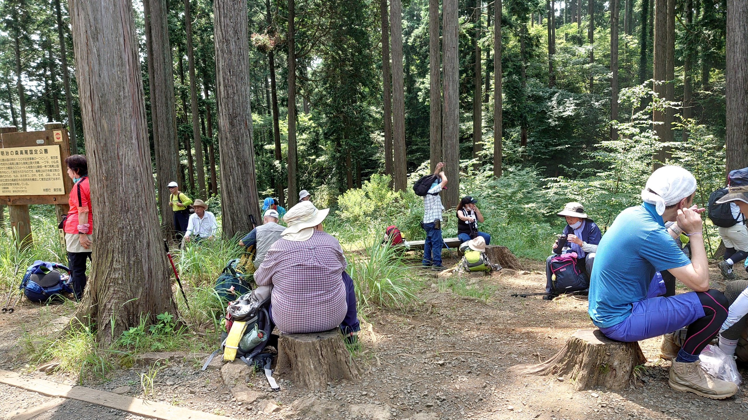 一丁平で休憩。この暑さの中の歩きに、ハイカーは腰を落として休まずにいられない。