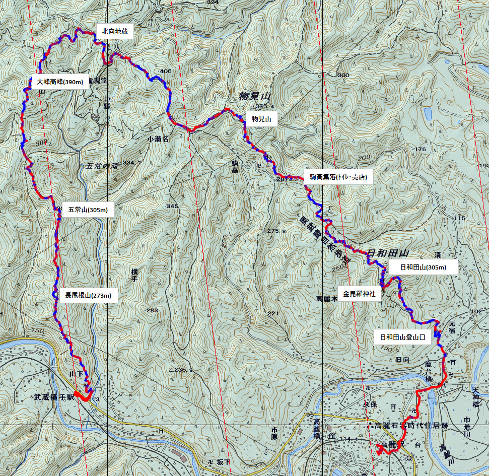 ▼コース : 武蔵横手駅8:30 →9:30 五常山 →10:20 大峰高峰 →10:40 北向地蔵 → 11:45 物見山 (昼食) →12:00 駒高集落 →12:25 高指山 →12:45 日和田山 →13:00 金毘羅神社 →13:25日和田山登山口(解散) ⇒ 高麗駅