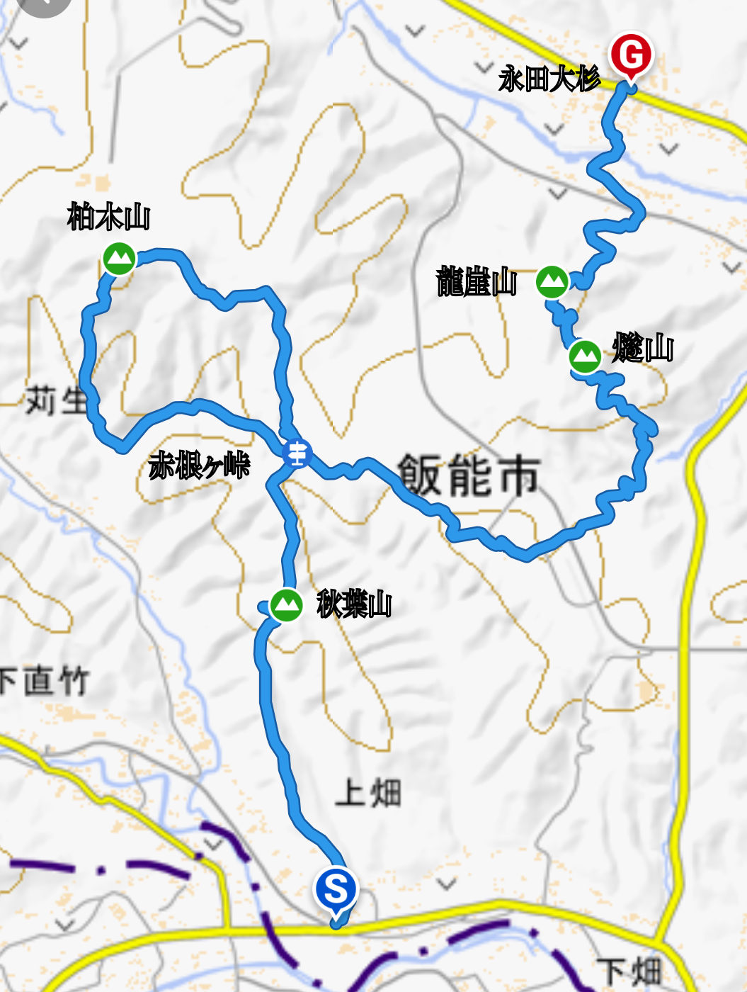 飯能駅8:35-(バス)-8:55上畑9:05-9:31秋葉山9:36-赤根ヶ峠9:50-(かもしか新道) -10:34柏木山10:47-11:38龍崖山公園(昼食)12:05-燧山12:28-12:45龍崖山