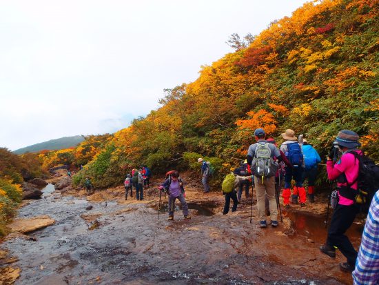 「紅葉の栗駒山」をTVで放映された為か、紅葉も人出も最高で、暫らく振りに見る見事な紅葉をたっぷりと味わえました。下山のコースへは続々と登ってくる人をかきわけ、避けながら泥んこの沢を下りました。