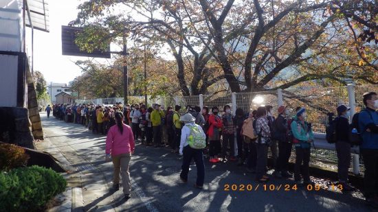 久しぶりの休日の晴れ間、甲斐大和駅には大菩薩へ向かうバスに約500人の列。