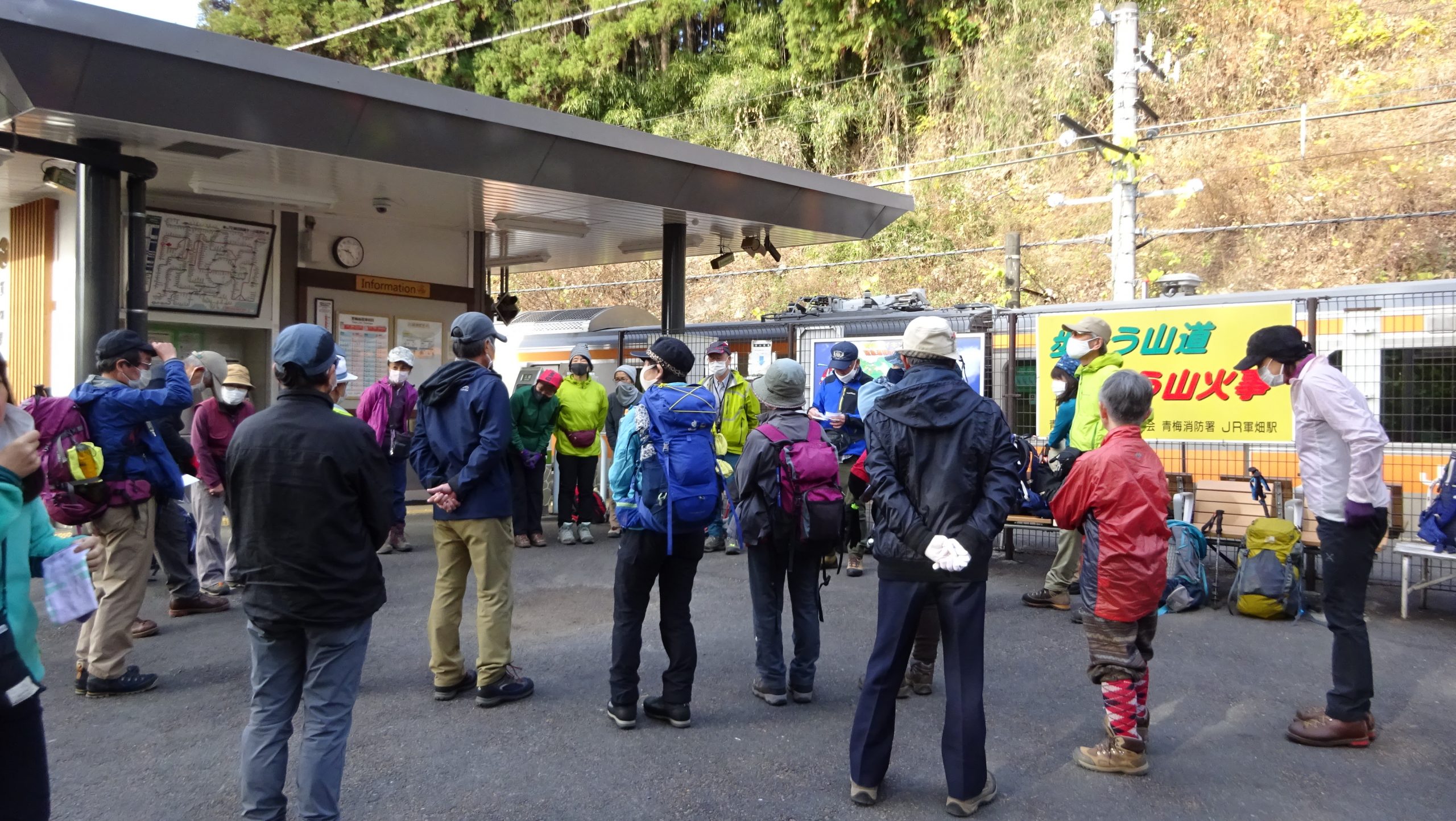 軍畑駅前、荻島Lより挨拶と佐々木Lより登山の際しての注意点などあり。