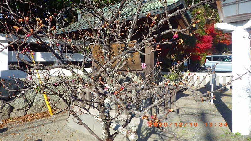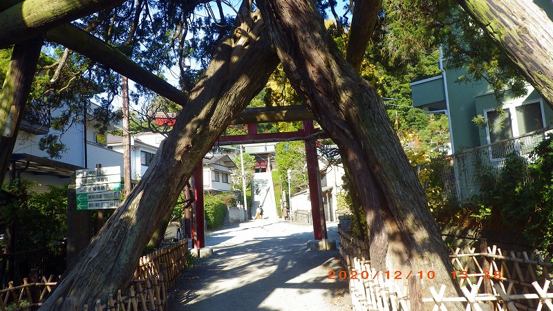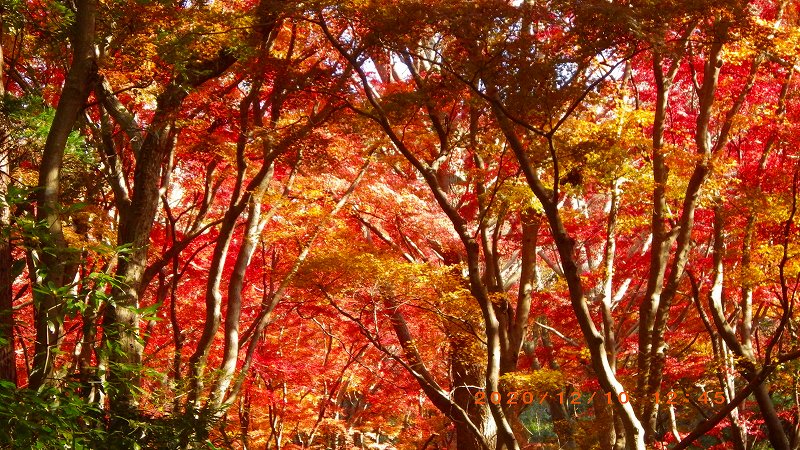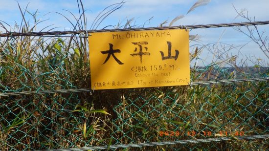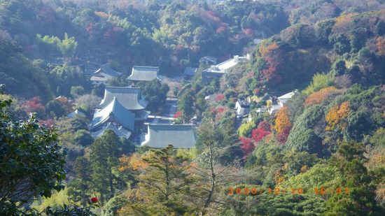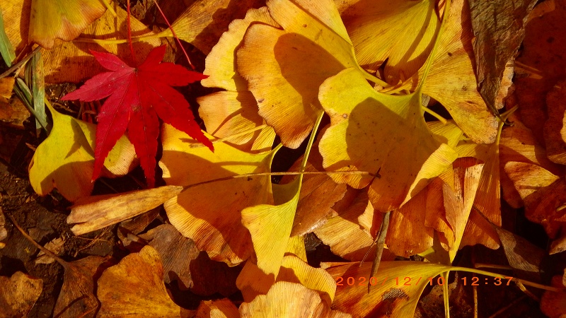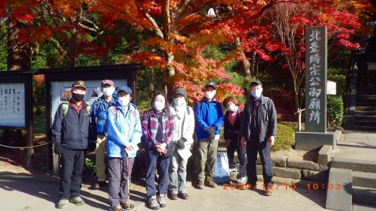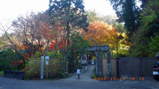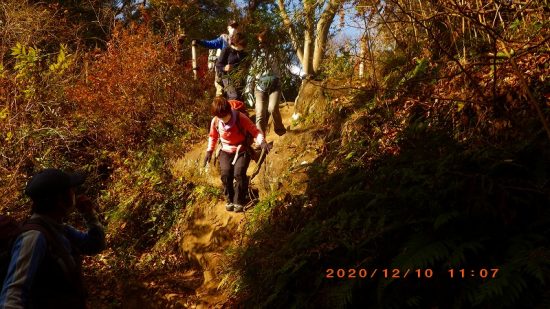 紅一点 2020年12月10日(木) 天候:晴れ レベル:一般向き 担当L :矢澤省三 協力者 :清水十三男 参加L :佐野満喜子 参加者 :9名(男性4名・女性5名) コース :JR北鎌倉駅10:05→明月院前→10:20天園コース入口→11:40大平山 (昼食)→12:30獅子舞谷→13:30鎌倉宮→鶴岡八幡宮14:00解散 歩程 :4時間 円覚寺 明月院前 建長寺 天園ハイキングコース 鎌倉市 最高峰 いよいよ獅子舞谷へ