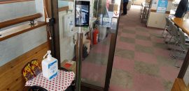食堂の入り口には消毒液と検温器 36.4正常でした 2大ベテランリーダと