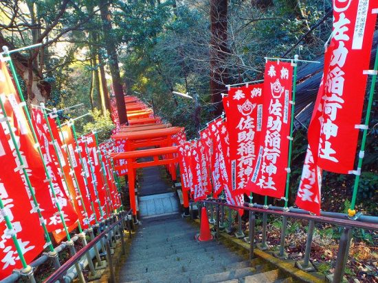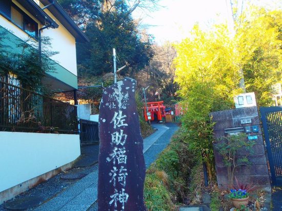 源頼朝が伊豆に流罪中に病に苦しんでいたら夢に現れ薬草を煎じ、旗揚げを勧めたのがこの稲荷で、頼朝の官位が左兵衛佐で佐殿「すけどの」と呼ばれていたことから佐助と命名される