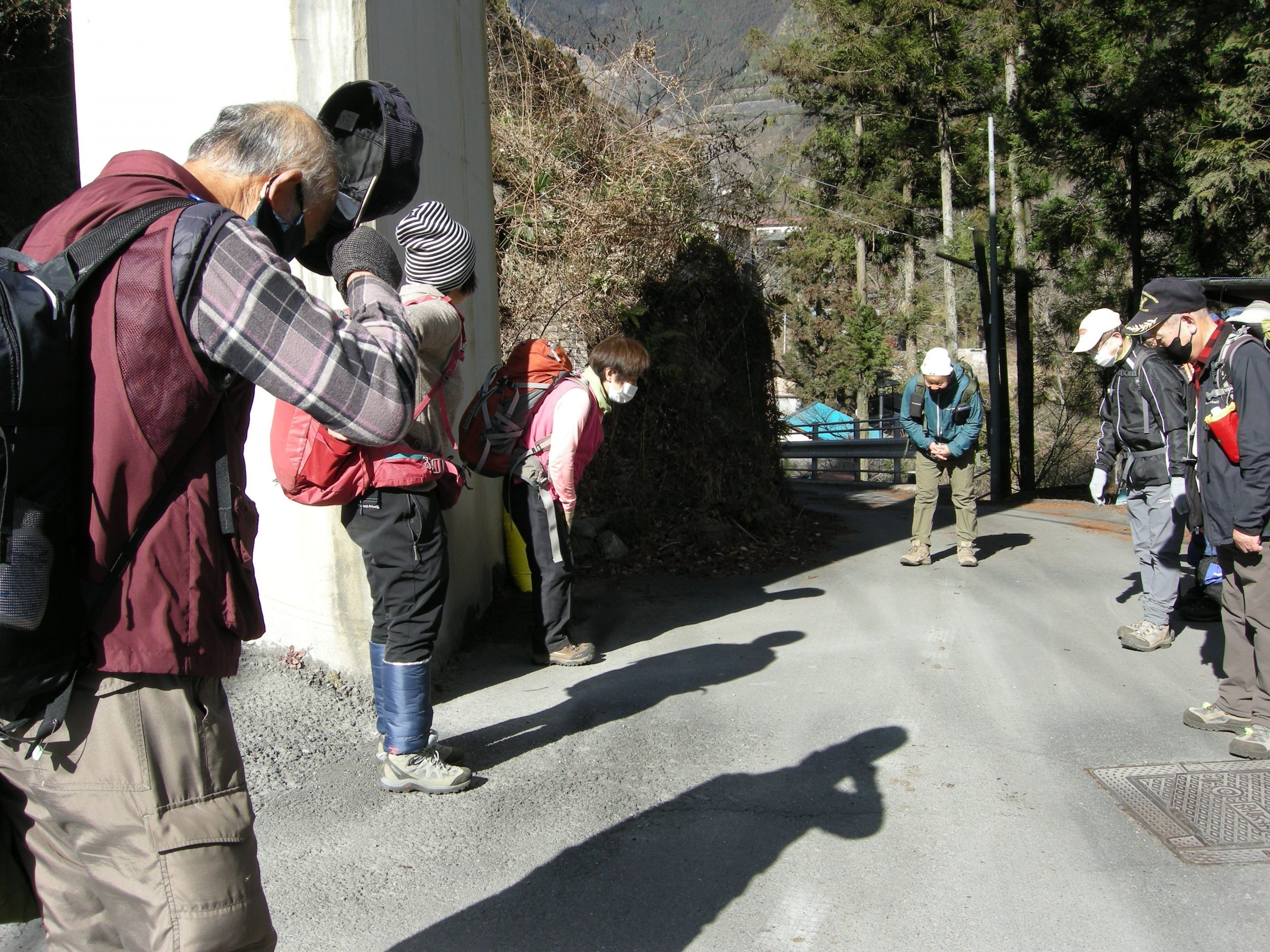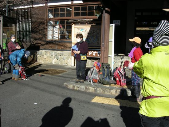 鳩ノ巣駅前にてリーダー挨拶コロナ禍の中での登山行動の注意を説明