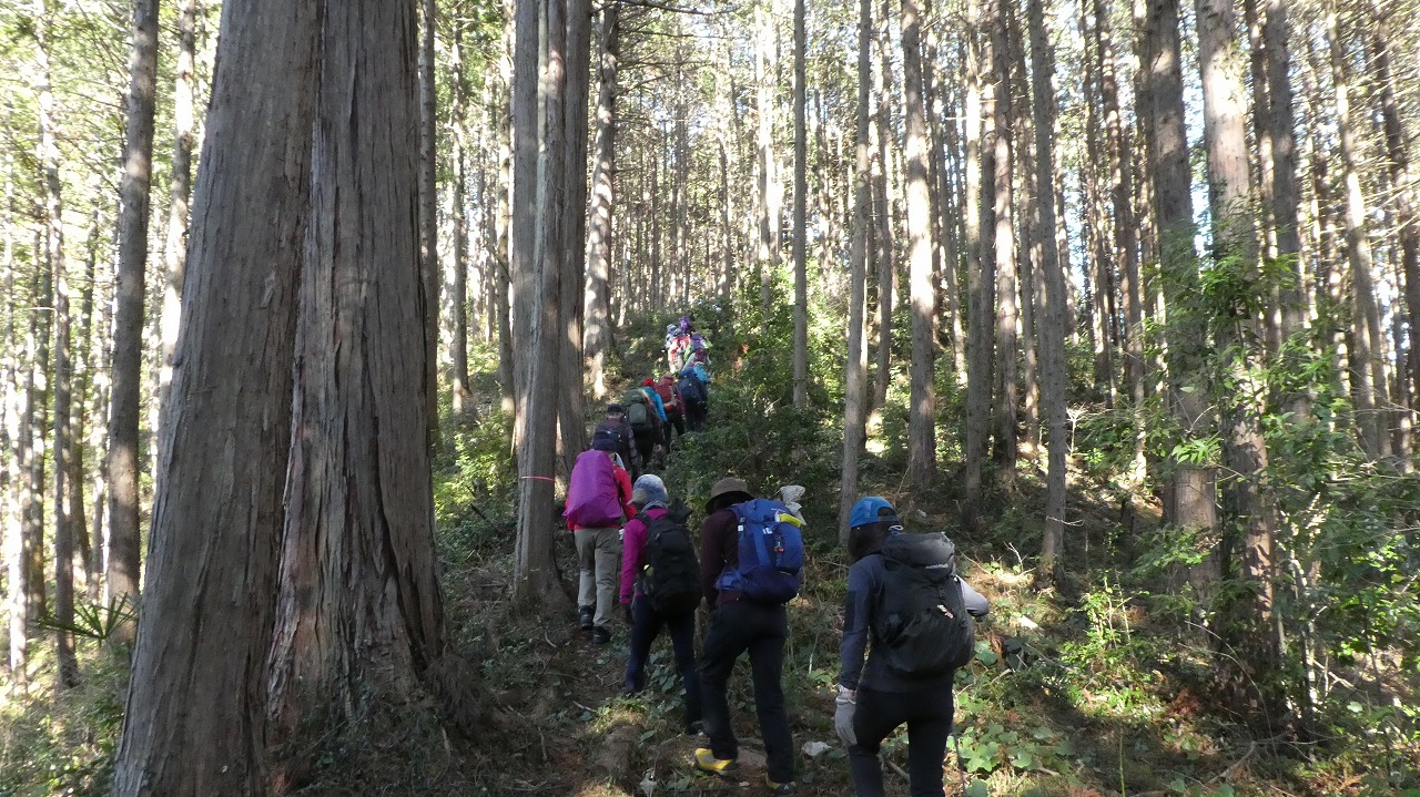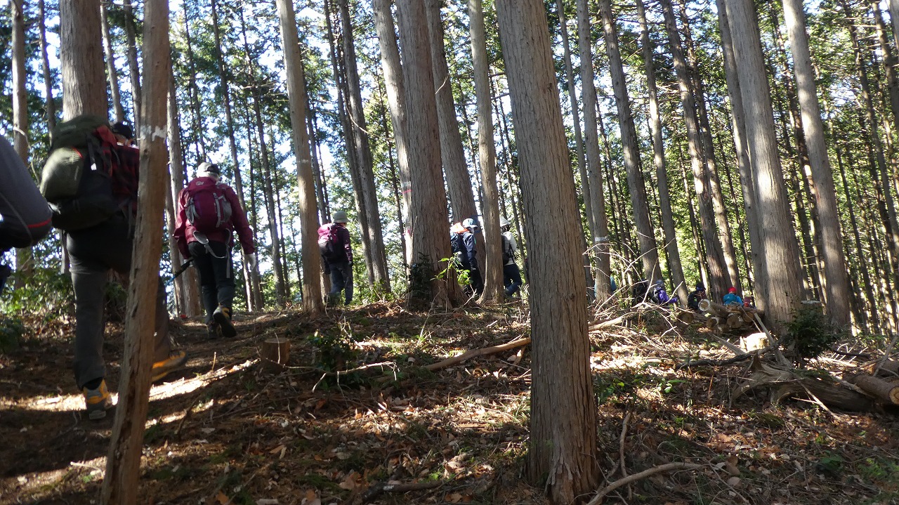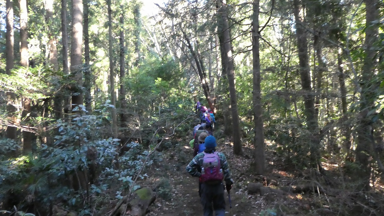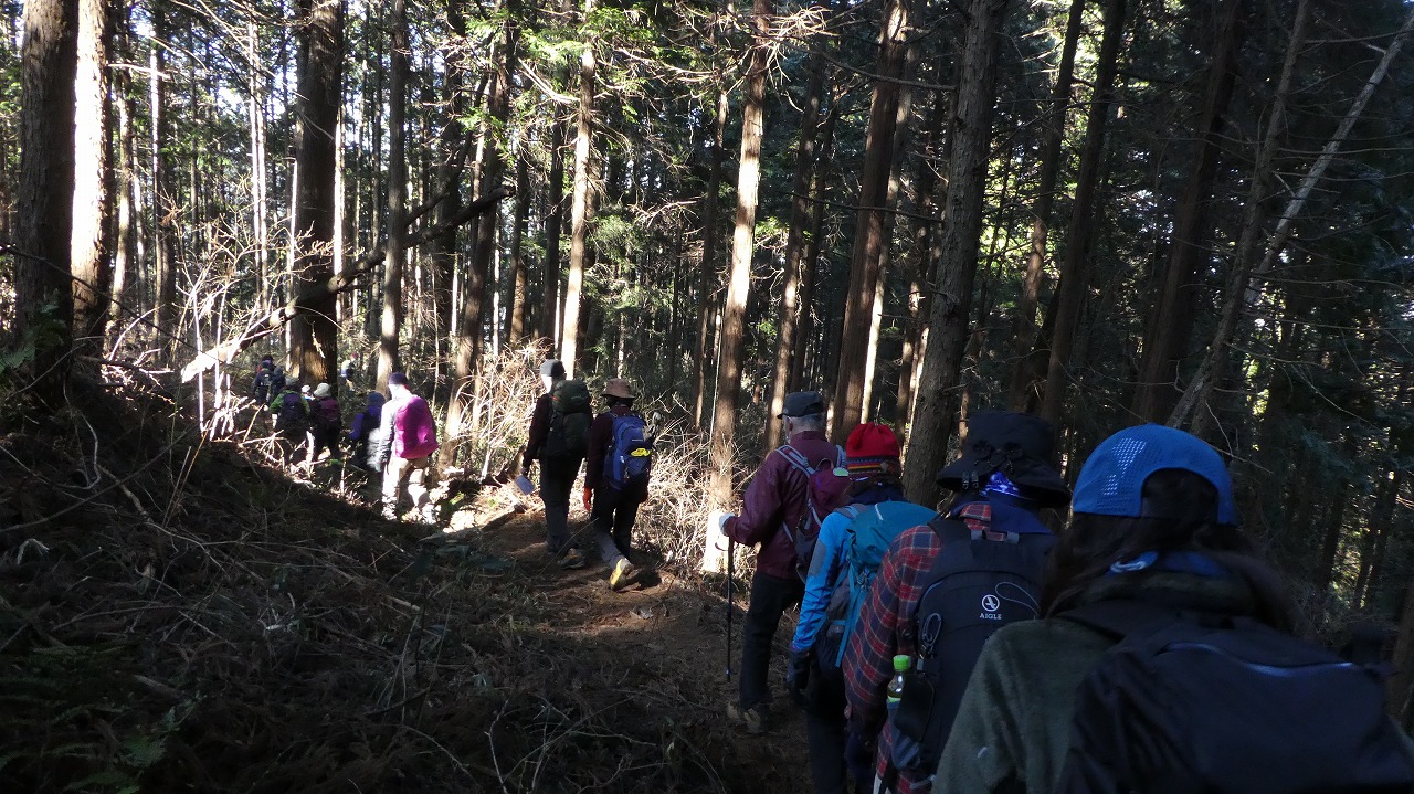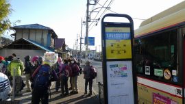 「会報予定にない駅到着後5分後発のバスに乗る作戦を立ててみた、各方々の電車中からのご協力と、改札口からのマジな走りで乗車完了。歩程30分の短縮に成功できた。今日のコースは展望には恵まれないが、地図読みの楽しさと、上を目指す登り感もあり、味わい深いコースと思った。