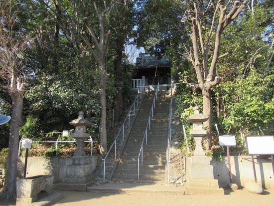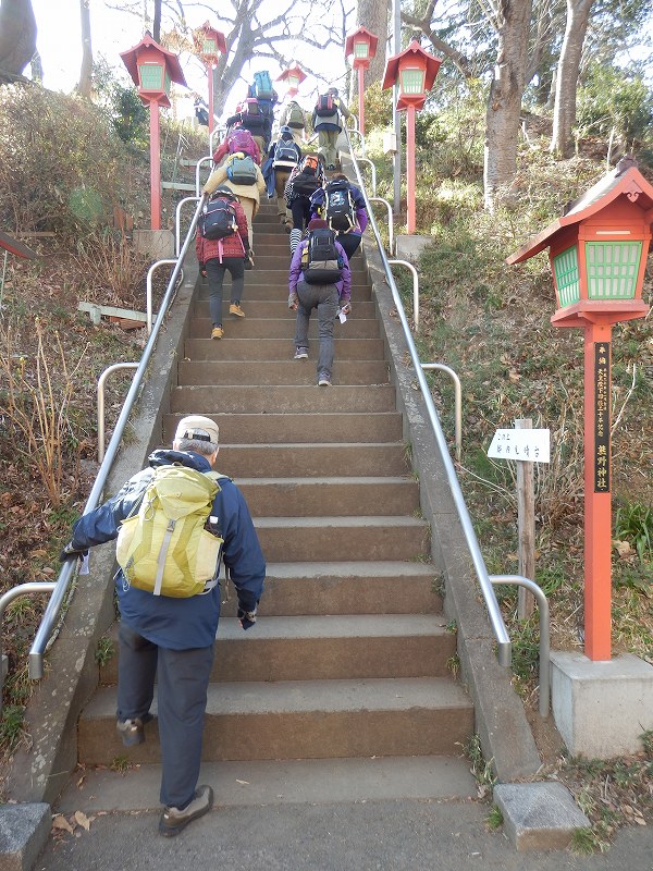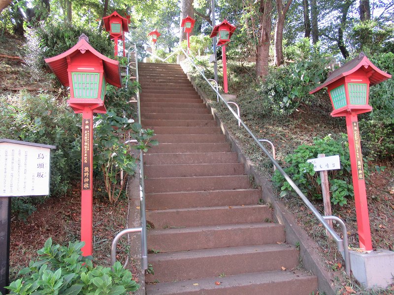 14:15 烏頭坂 以前は杉並木うっそうとした所だったそうです。新河岸川から荷揚げされた荷物を運ぶのに必ず通る坂で難所をして知られていたと案内板に記されています。石段の上は熊野神社です。