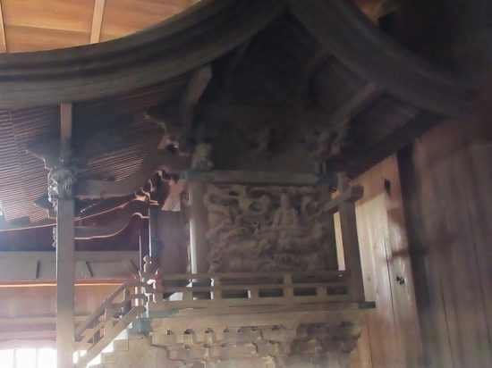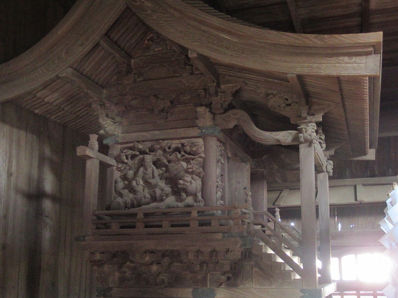 本殿の江戸彫り彫刻は見られるように両脇が格子になっています。暗くて目を凝らさないと見えません!