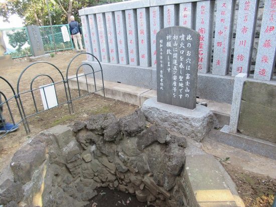 富士塚の裏には富士山の噴火口があります。開運及び安産祈願と書いてありました。