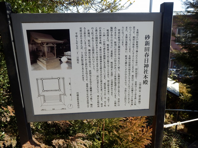 13:45 砂新田春日神社 階段上にある本殿の江戸彫り彫刻は川越市の有形文化財になっています。