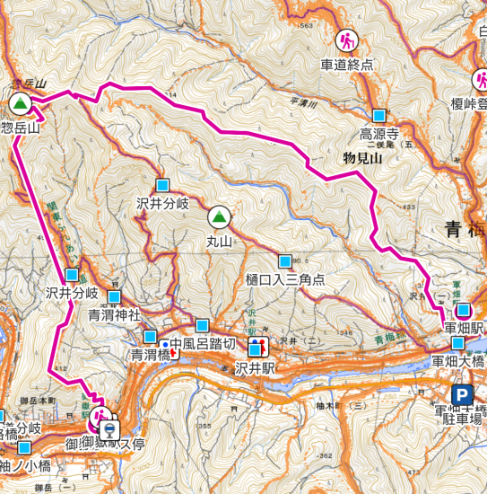 (昼食)12:10-12:50(556m峰)12:57-13:17物見山13:20-東光寺14:15-