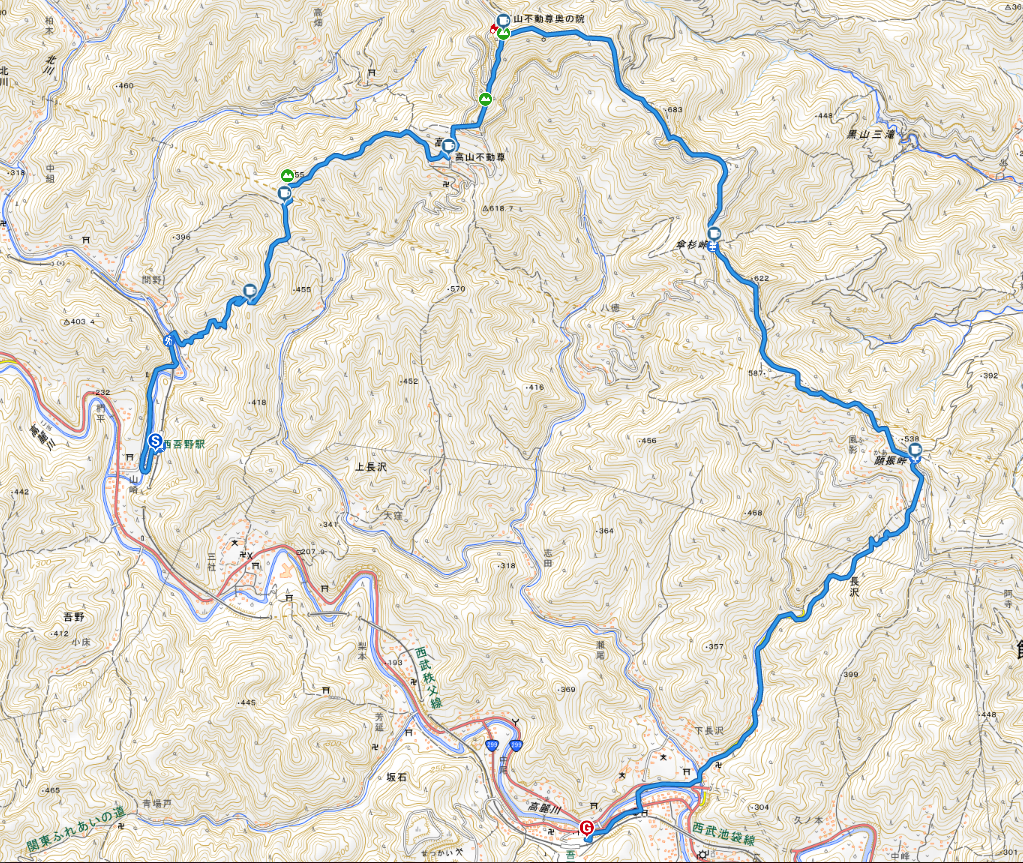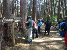 ▼コース :西吾野駅前09:25→10:30赤坂→11:00高山不動→11:30関八州見晴台(昼食~12:00)→13:00傘杉峠→顔振峠→吾野駅14:40
