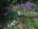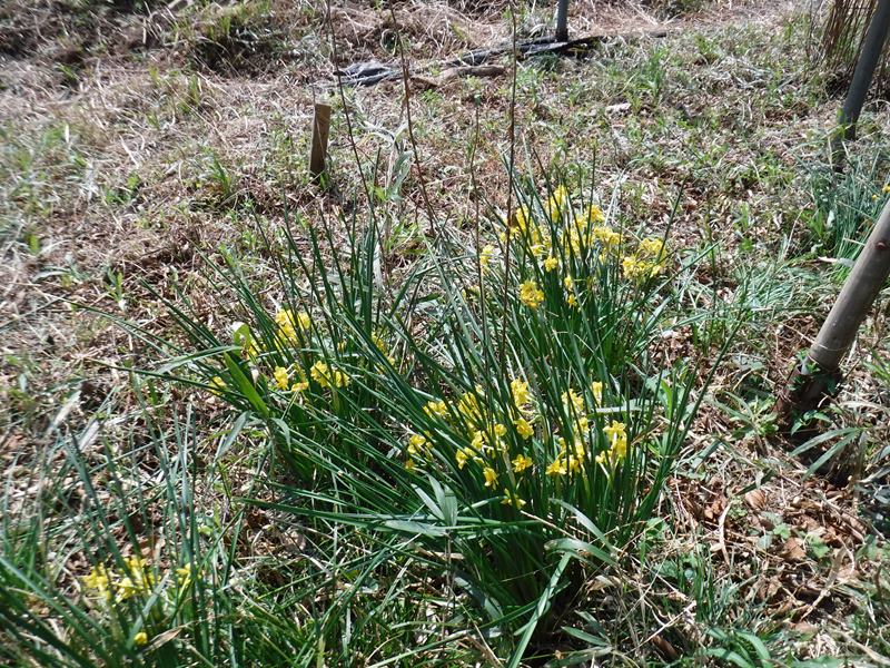 スイセン、ジュウニヒトエ、エイザンスミレ、ヤマルリソウ等、白、黄、紫色とりどりの花