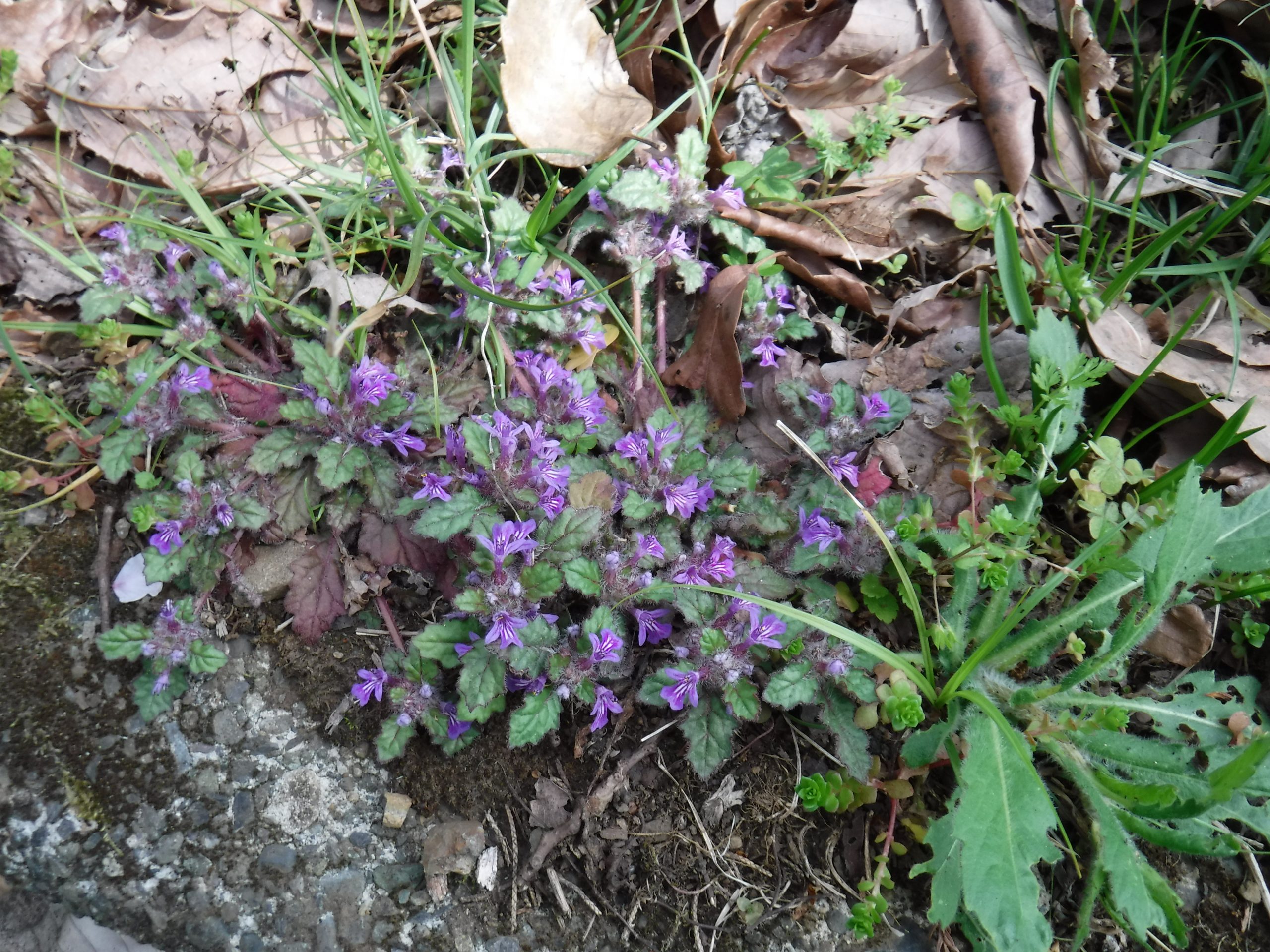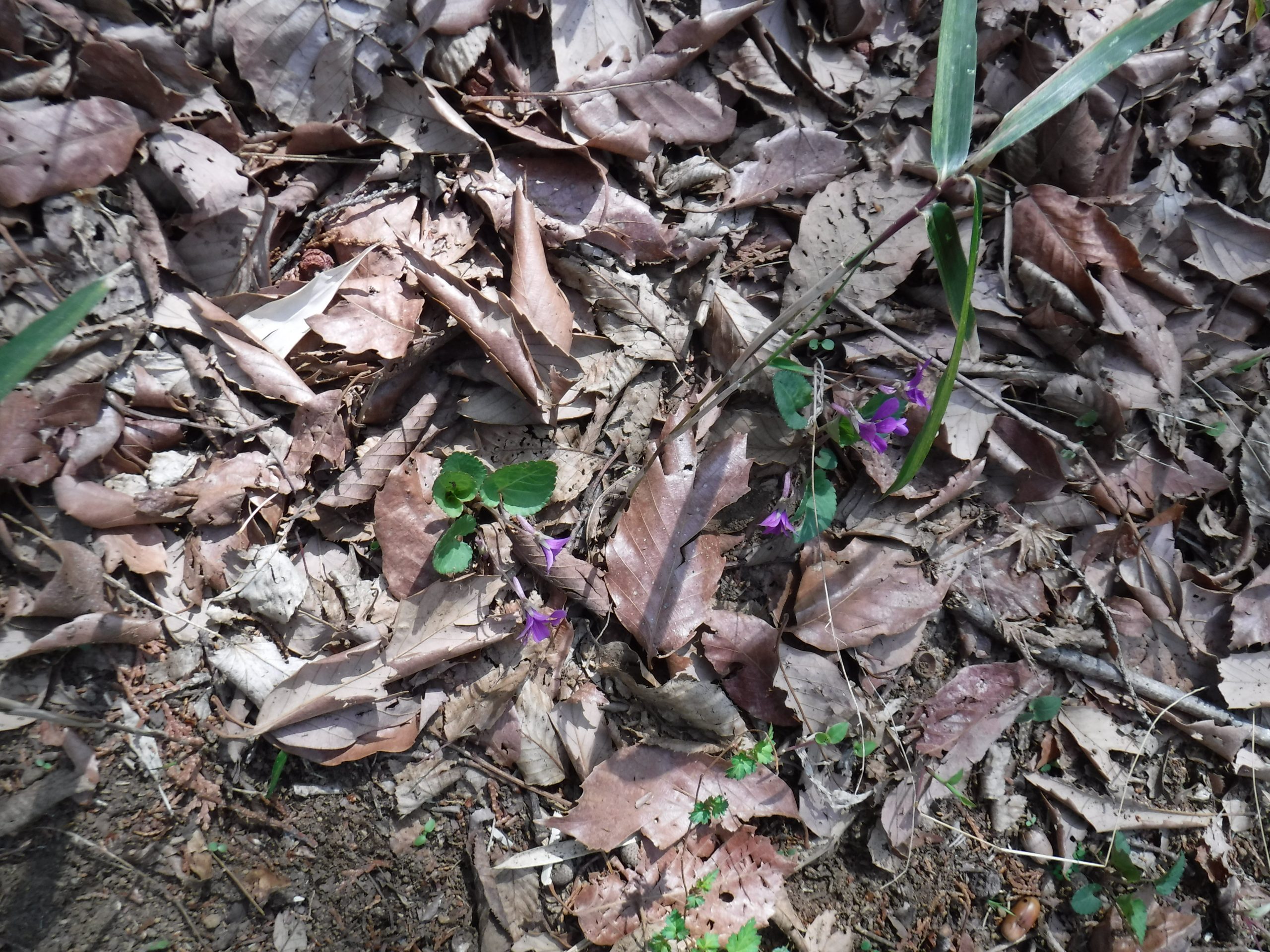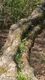 大木の中に一輪の紫色スミレ・可愛い♡♡、キジムシロ「明るく輝いて」
